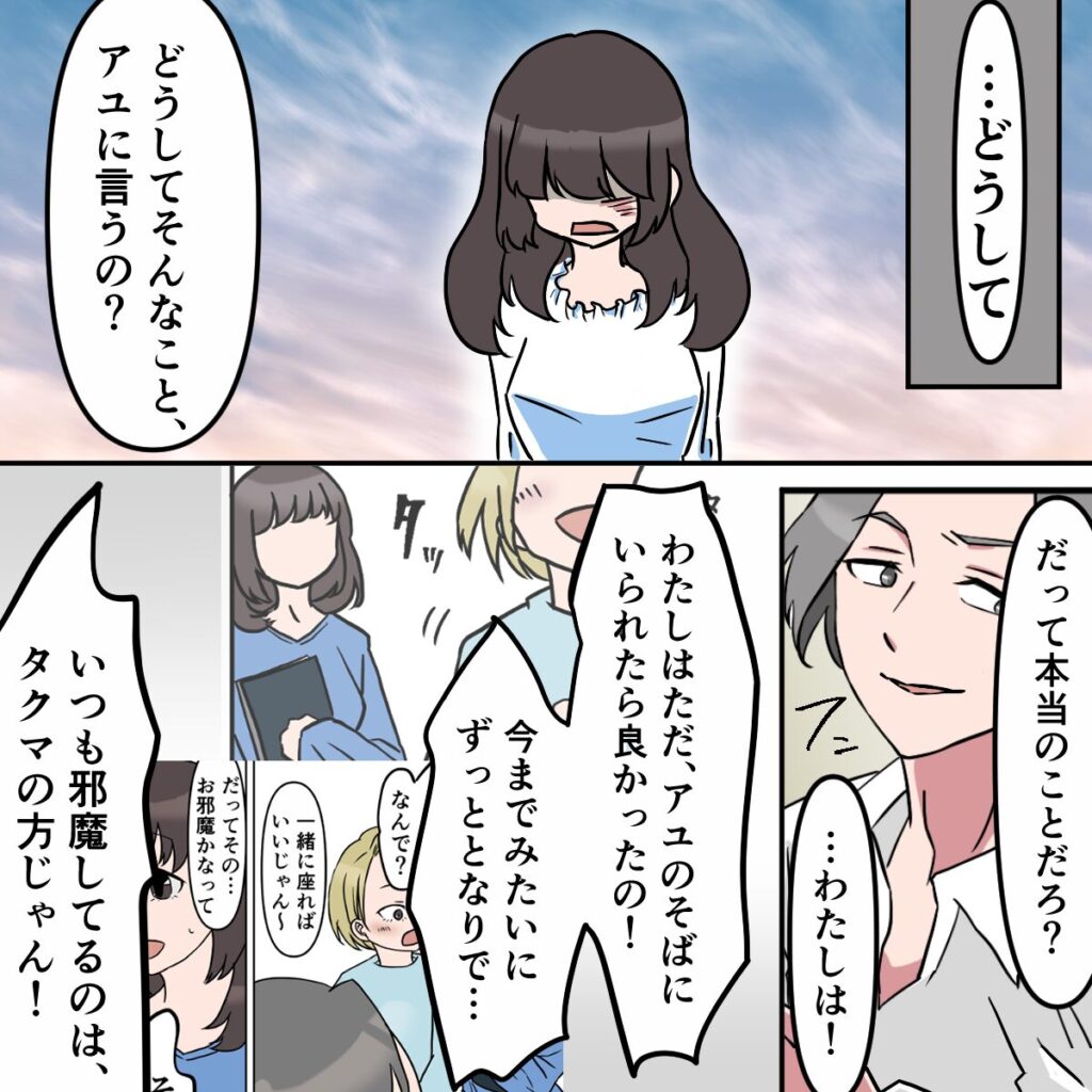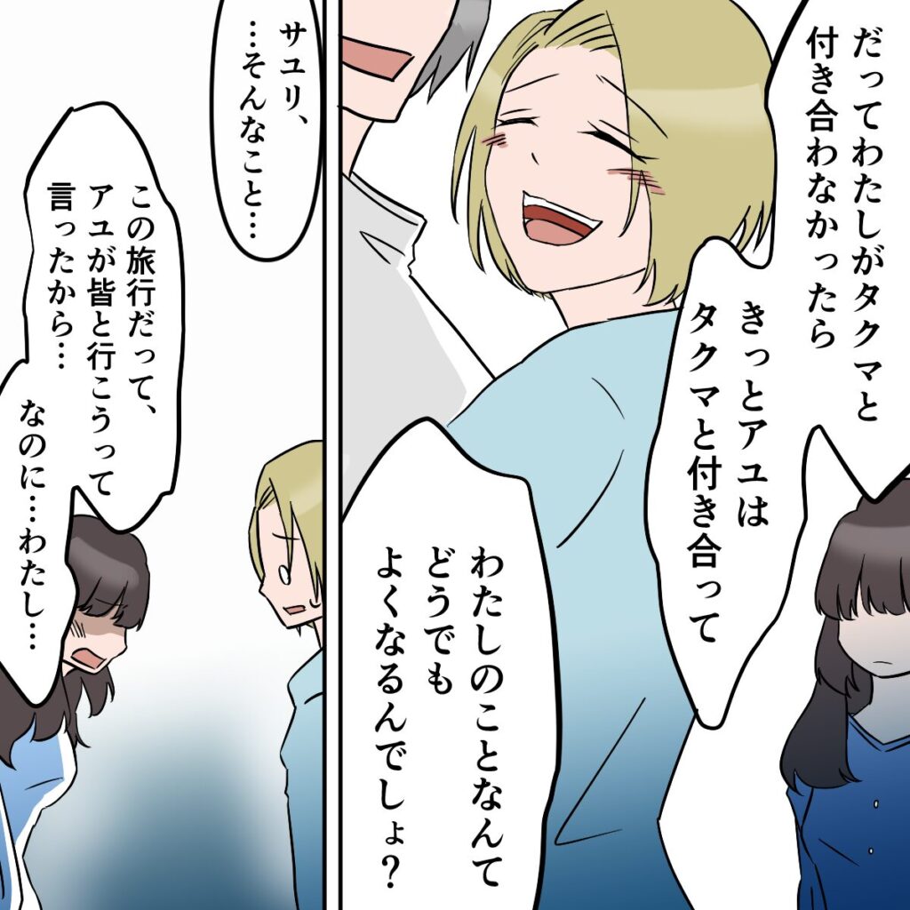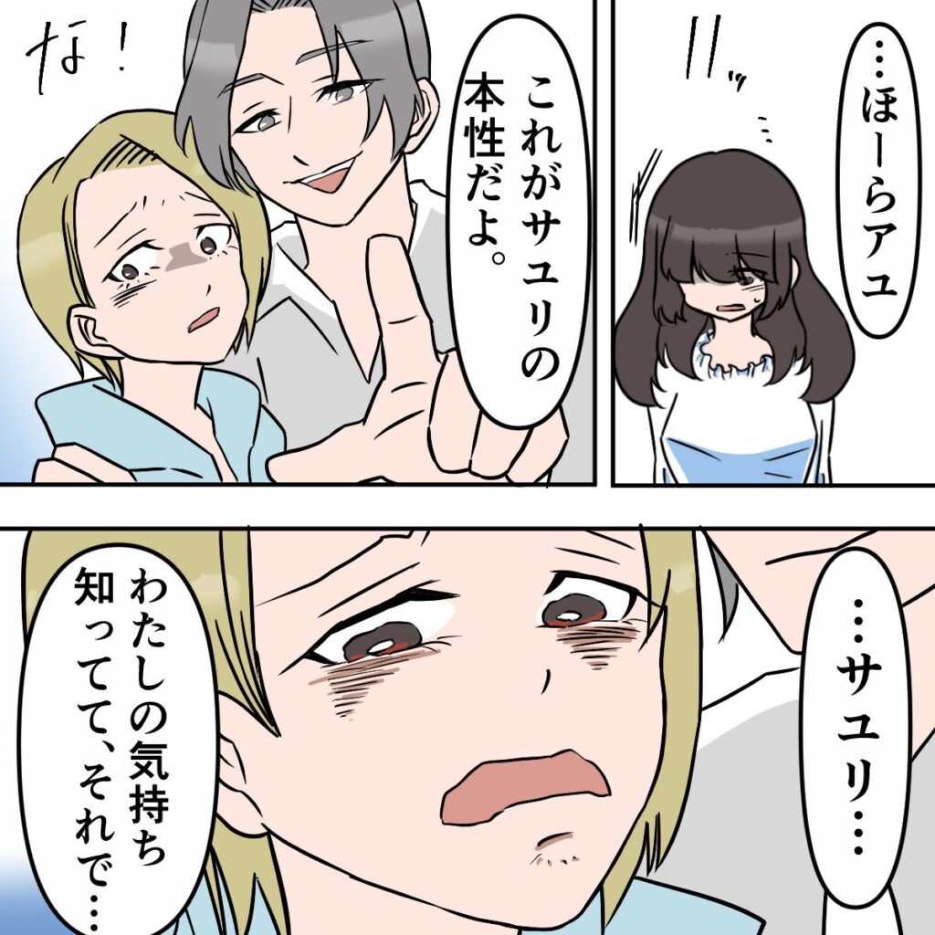 私を探して駆けつけたサユリさんがタクマさんから私を引き離すとすごい形相に。するとタクマさんは「サユリが好きなのはアユなんだろ?」と暴露。「アユを取られないために好きでもないやつと付き合う」と言うタクマさんの言葉を否定しないサユリさんを見て動揺しました。