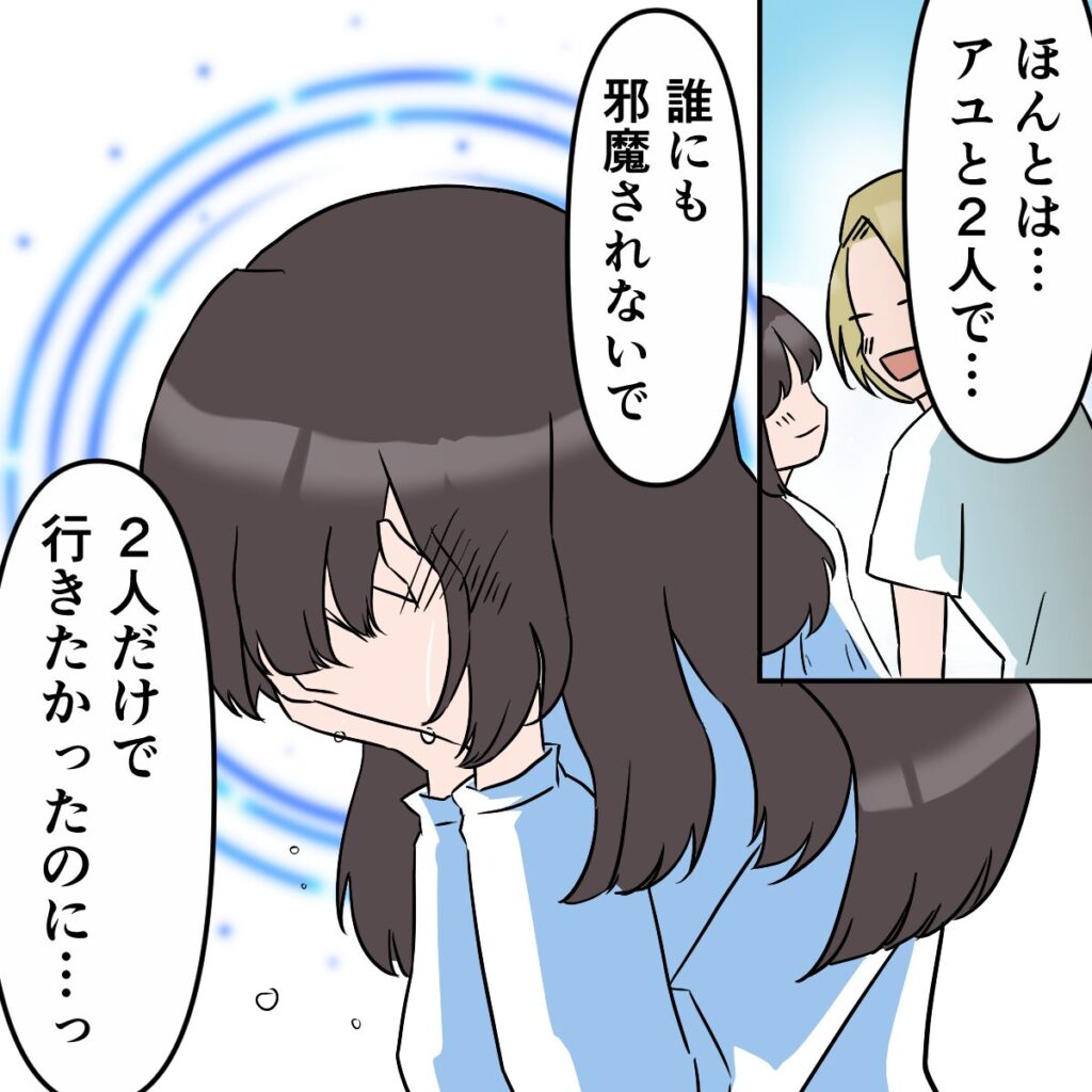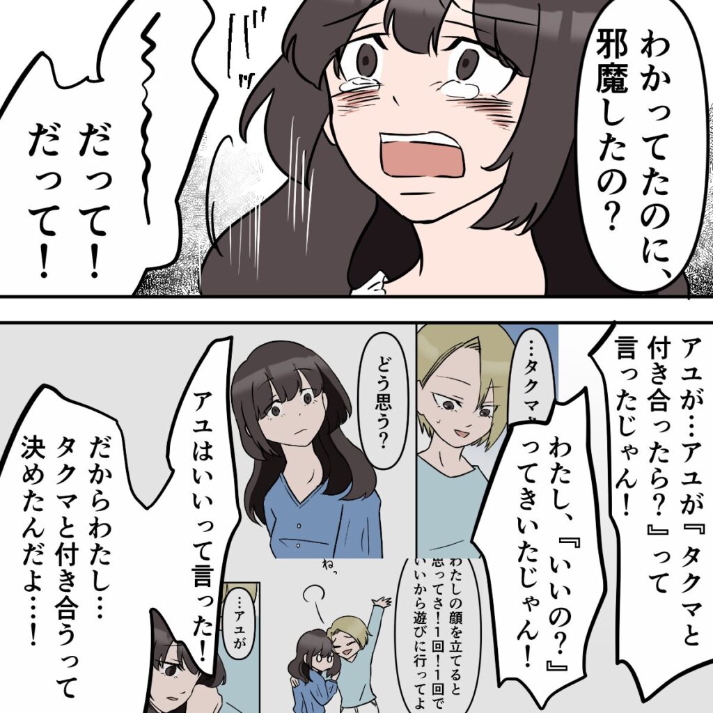 「わかってたのに、邪魔したの?」私がそう言うと、「だって!だって!アユが・・アユが『タクマと付き合ったら?』って言ったじゃん!わたし『いいの?』ってきいたじゃん!アユはいいって言った!だからわたし・・タクマと付き合うって決めたんだよ・・!」サユリはそう言った後、