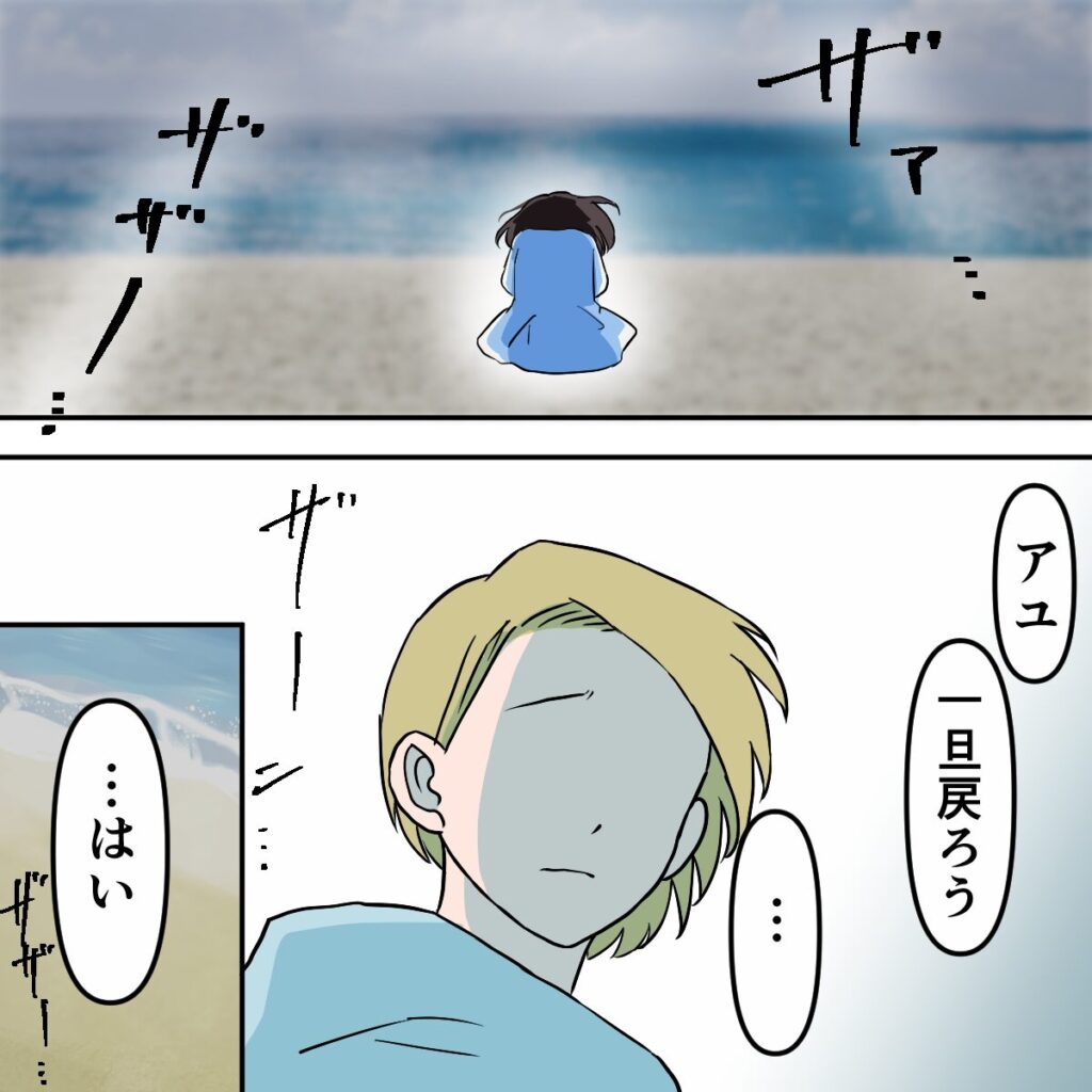 海辺に一人座り込むサユリの背中を見つめ、「アユ、一旦戻ろう」そう言われた後も「・・はい」何度も何度も振り返りながらロッジへと戻ったのでした。
