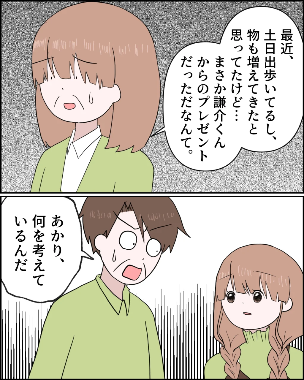 すると、「最近、土日で歩いてるし、物も増えてきたと思ってたけど・・まさか謙介くんからのプレゼントだっただなんて」叔母さんが動揺すると、「あかり、何を考えているんだ」と叔父さんがあかりちゃんに言いました。