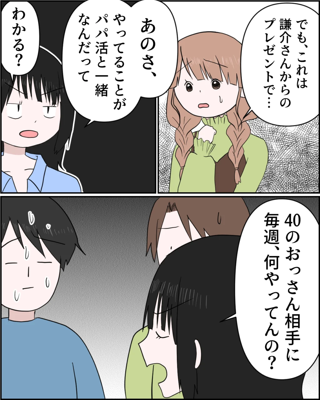 「でも、これは謙介さんからのプレゼントで・・」と答えるあかりちゃんに、「あのさ、やってることがパパ活と一緒なんだって。わかる?」と舞花ちゃん。さらに「40のおっさん相手に毎週、何やってんの?」
