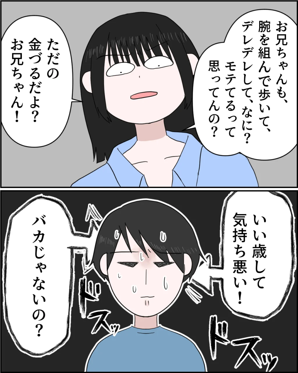 そう言った後、「お兄ちゃんも、腕を組んで歩いて、デレデレして、なに?モテてるって思ってんの?ただの金づるだよ?お兄ちゃん!いい歳して気持ち悪い!バカじゃないの?」と溺愛していた妹の言葉が謙介のボディにじわじわと効いているようで、途端に顔色が悪くなりました。