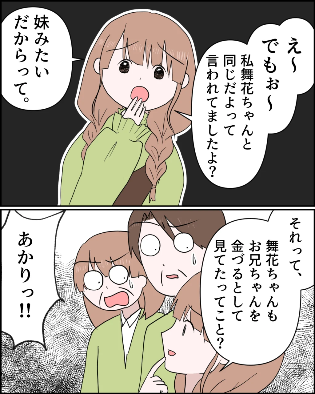 すると、「え~でもぉ~。私舞花ちゃんと同じだよって言われてましたよ?妹みたいだからって。それって、舞花ちゃんもお兄ちゃんを金づるとして見てたってこと?」シレっと凄いことを言い出すあかりちゃんを見て、「あかりっ!!」叔母さんが慌ててそう言うと、