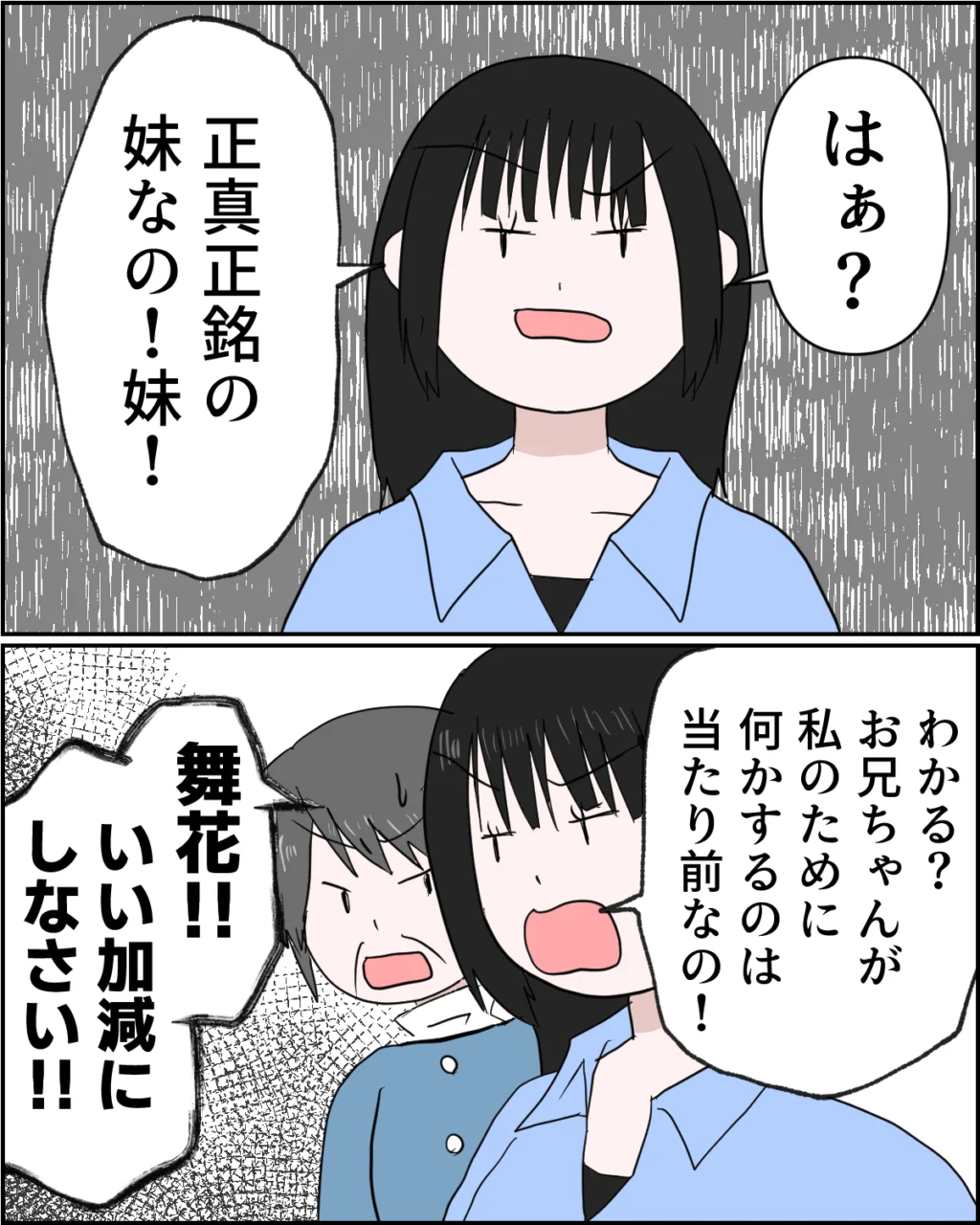 「はぁ?正真正銘の妹なの!妹!わかる?お兄ちゃんが私のために何かするのは当たり前なの!」と舞花ちゃんが言い出し、今度は義母が「舞花!!いい加減にしなさい!!」と舞花ちゃんを止めに入るのでした。