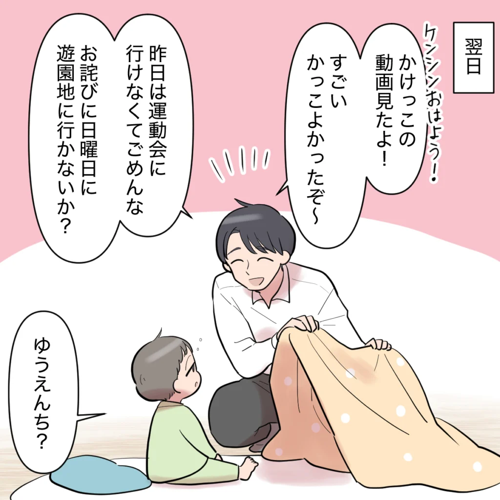 翌日。シンジはケンシンを起こしに行くと、「ケンシンおはよう!かけっこの動画見たよ!すごいかっこよかったぞ~」とケンシンの頑張りをたくさん褒め、「昨日は運動会に行けなくてごめんな。お詫びに日曜日に遊園地に行かないか?」と謝り、埋め合わせに遊園地に連れて行くと言いました。ケンシンは「ゆうえんち?」と寝ぼけていましたが、