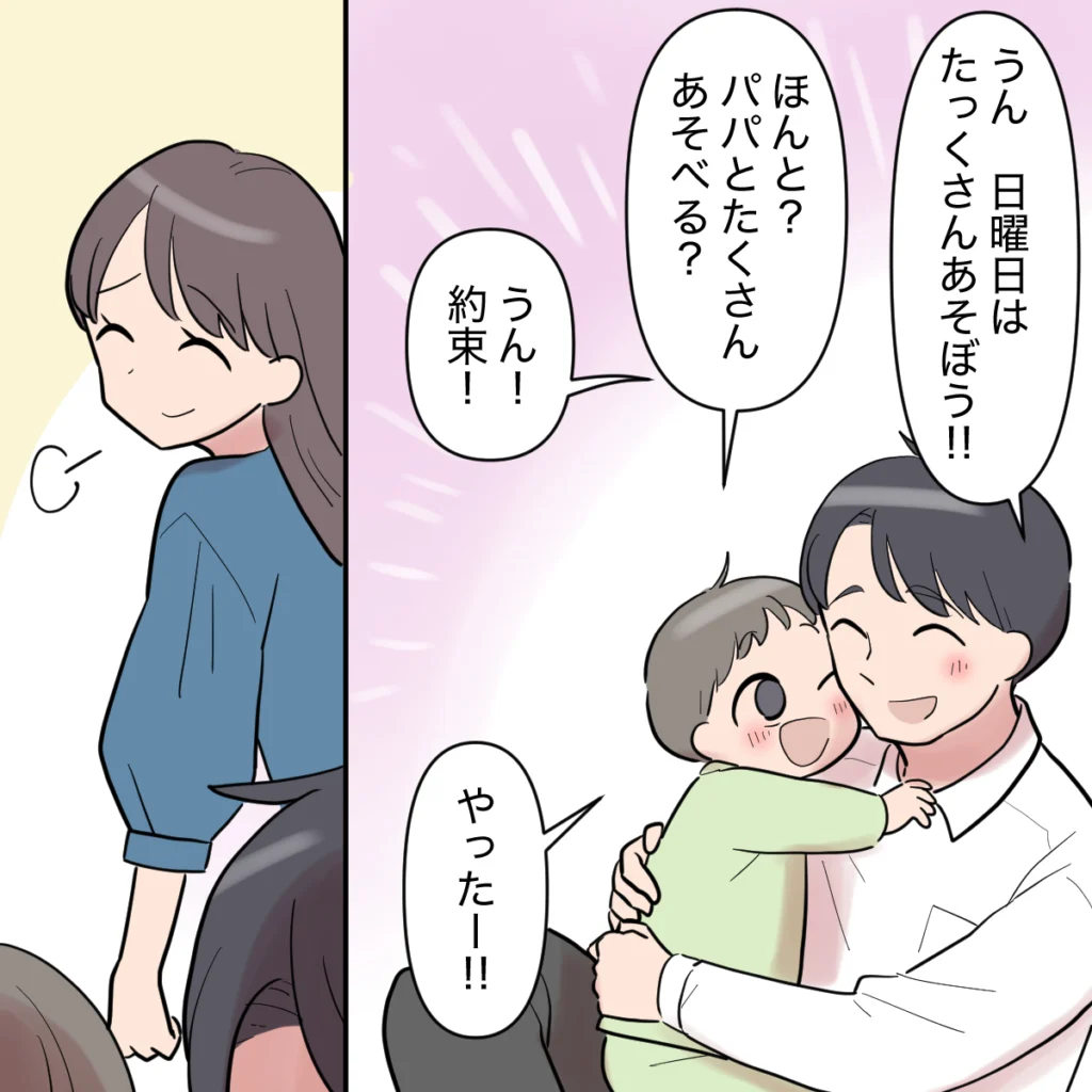 しばらくしてシンジの言葉を理解したケンシンはパッと目を輝かせました。「うん。日曜日はたっくさんあそぼう!!」とシンジが言うと「ほんと?パパとたくさんあそべる?」と嬉しそうなケンシン。「うん!約束!」と力強く言うシンジの言葉にケンシンは「やったー!!」と大喜び。私はそんな2人のやり取りを微笑ましく見守りながら、昨夜シンジに気持ちをちゃんと伝えてよかったと思いました。