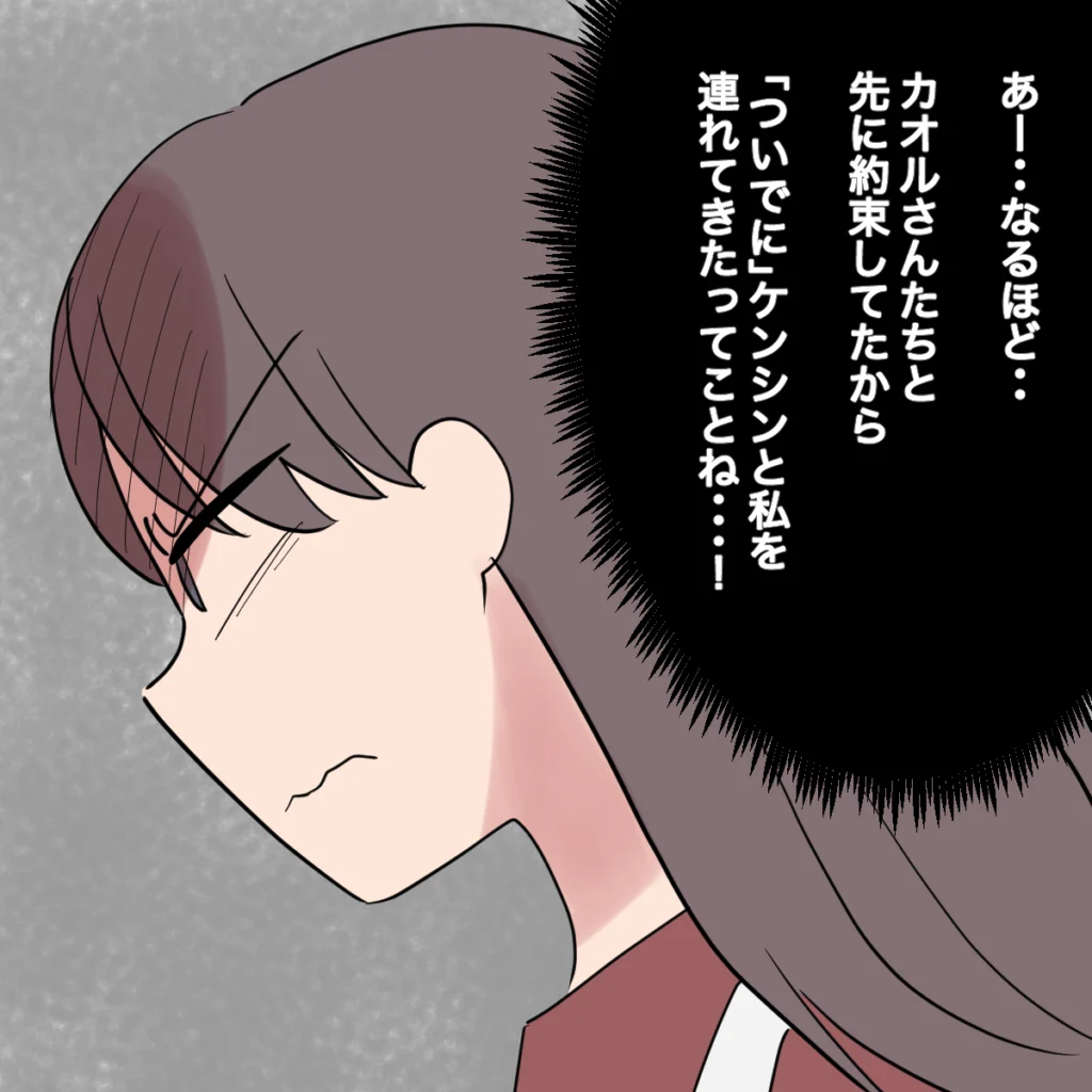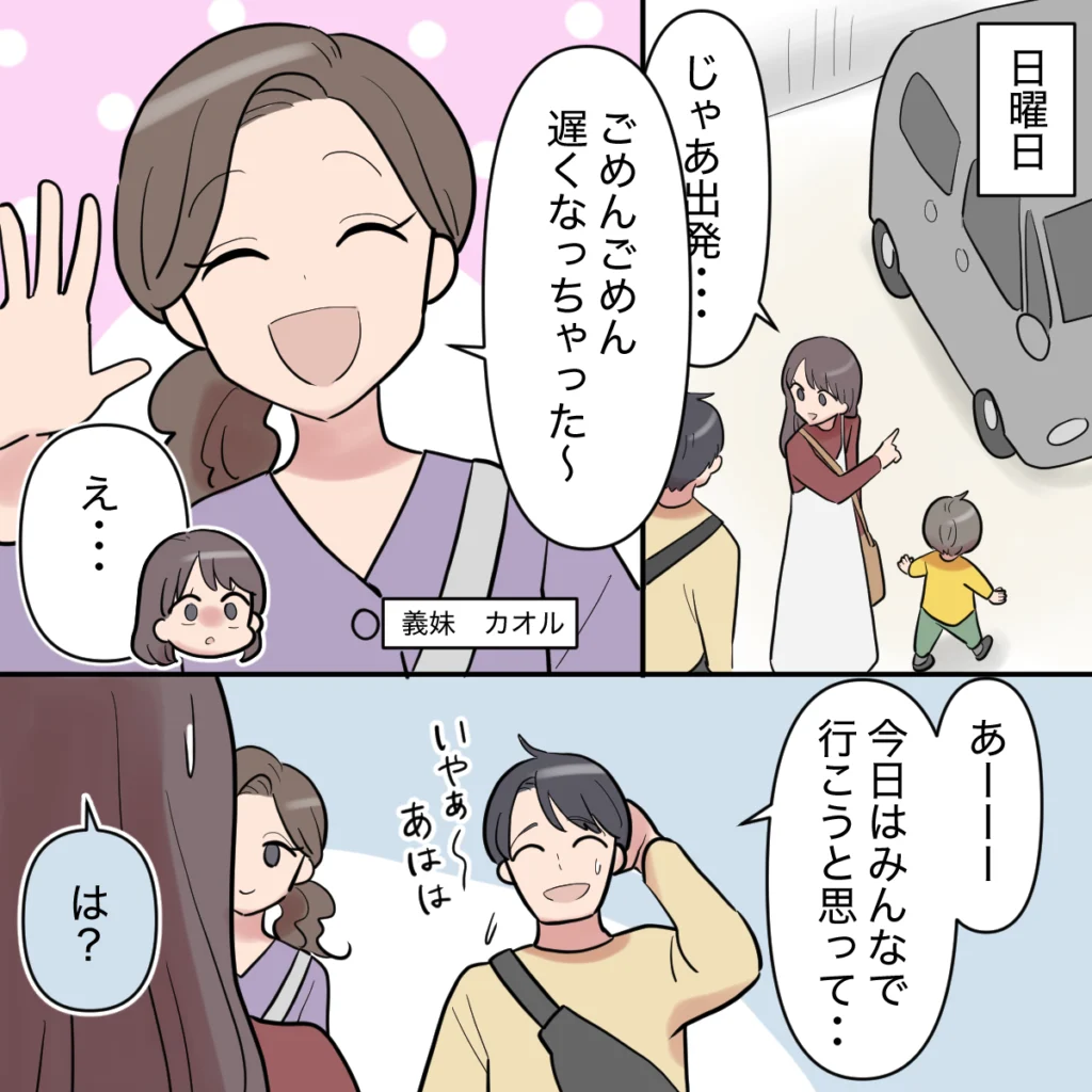 そして約束の日曜日。ケンシンは朝からウキウキです。駐車場に向かい「じゃあ出発・・」と車に乗ろうとした時、突然「ごめんごめん。遅くなっちゃった~」となぜかカオルさんとタイガくんが現れました。状況が飲み込めず「え・・」と固まっていると、「あーーー。今日はみんなで行こうと思って・・。いやぁ~、あはは」とシンジがヘラヘラ笑いながら言いました。「は?」私がそう聞き返すと、