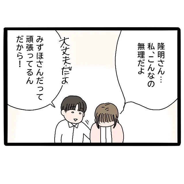 「隆明さん・・私、こんなの無理だよ」俯きながら私がそう言うと、「大丈夫だよ。みずほさんだって頑張ってるんだから!」と励ますように隆明が言いました。