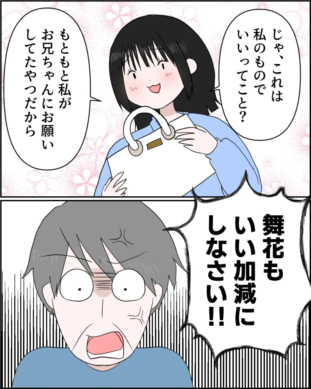 しかし、あかりちゃんに厳しい言葉を言い放った舞花ちゃんは「じゃ、これは私のものでいいってこと?もともと私がお兄ちゃんにお願いしてたやつだから」とにんまりしてカバンを手に取りました。さすがの義父も我慢の限界だったようで「舞花もいい加減にしなさい!!」と物凄い剣幕で声を荒げました。