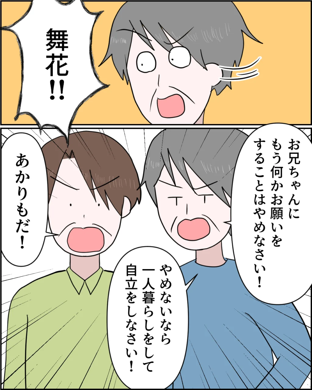 義父は舞花ちゃんの方へ勢いよく振り返ると、「お兄ちゃんにもう何かお願いをすることはやめなさい!やめないなら1人暮らしをして自立しなさい!」と厳しく言い放ちました。あかりちゃんのお父さんも続けて、「あかりもだ!」と声を荒げます。