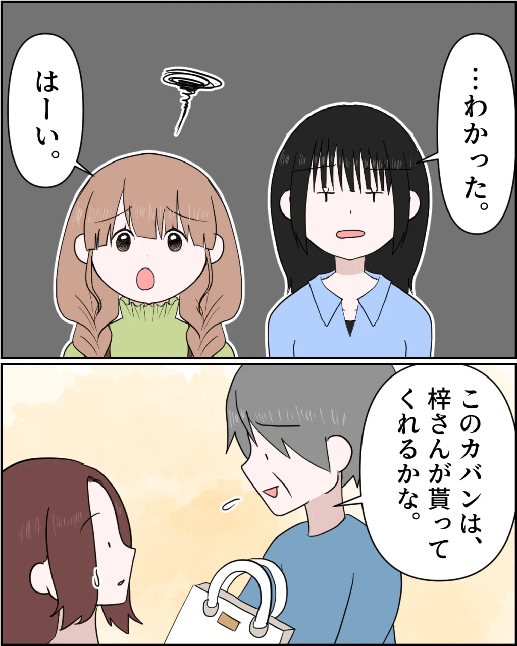 両親に叱られた舞花ちゃんとあかりちゃんは、「・・・わかった」「はーい」と、それぞれ返事をしました。どこか腑に落ちない表情を浮かべてはいましたが、これ以上反論することはできないみたい。すると義父がこちらを向いて、「このカバンは梓さんが貰ってくれるかな」と例の15万円もするバッグを差し出してきました。