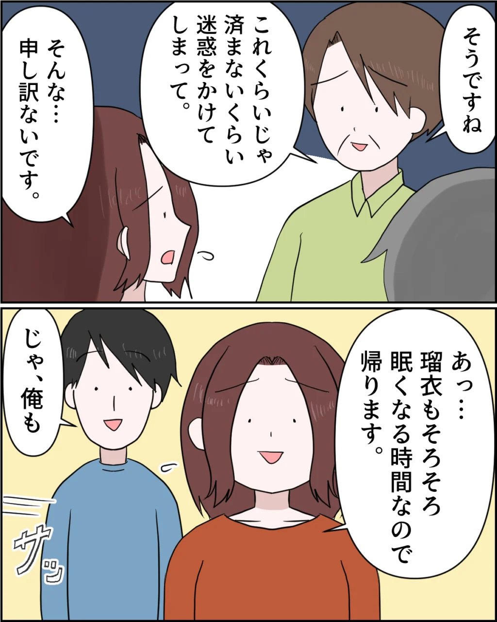 あかりちゃんのお父さんもバッグを私に渡すことに賛成のようで、「そうですね、これくらいじゃ済まないくらい迷惑をかけてしまって」と申し訳なさそうに頭を下げました。私は「そんな・・・申し訳ないです」と遠慮しましたが、2人に強く勧められ、結局謙介があかりちゃんのために買ったバッグを受け取ることに。その後、瑠衣もそろそろ眠くなる時間だったので帰ろうとすると、なぜか謙介が「じゃ、俺も」と当たり前のように便乗してきたのです。