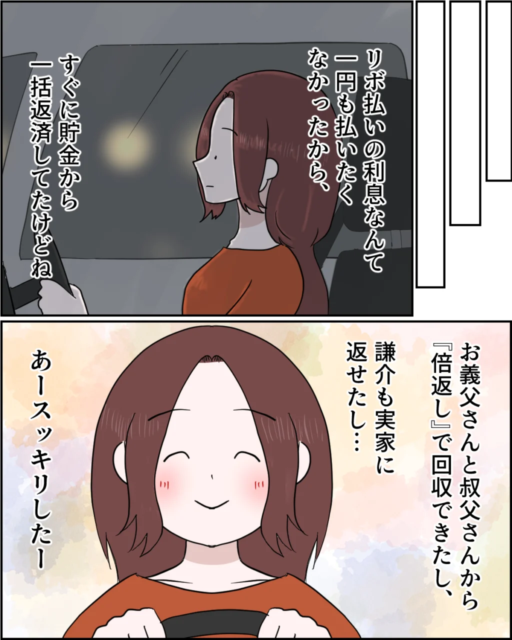 実は、リボ払いの利息なんて1円たりとも払いたくなかったので、とっくに貯金から一括で返済していました。だけど結果的に、お義父さんと叔父さんからは『倍返し』で回収できたし、謙介も実家に返せたし・・・すべてが思った以上にうまく片付きました。あースッキリしたー!