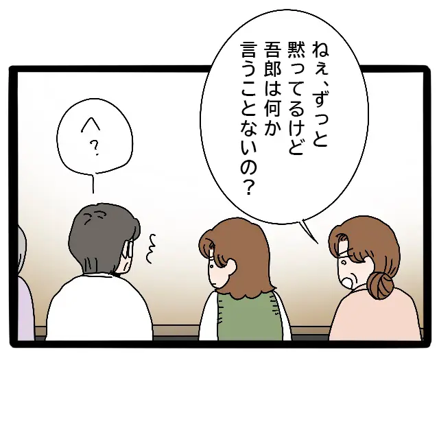 まさか自分に話が振られると思っていなかったようで「姉さん・・」と気まずそうな父。そんな父を見て、嫁いびりは父にとっては他人事なのだなと改めて感じました。自分の母親が妻をいびっていると知りながらずっと見て見ぬふりをしてきた父・・。母が嫁いびりの負の連鎖を繰り返してしまうのは、母を守ってあげなかった父にも原因があるように思えます。