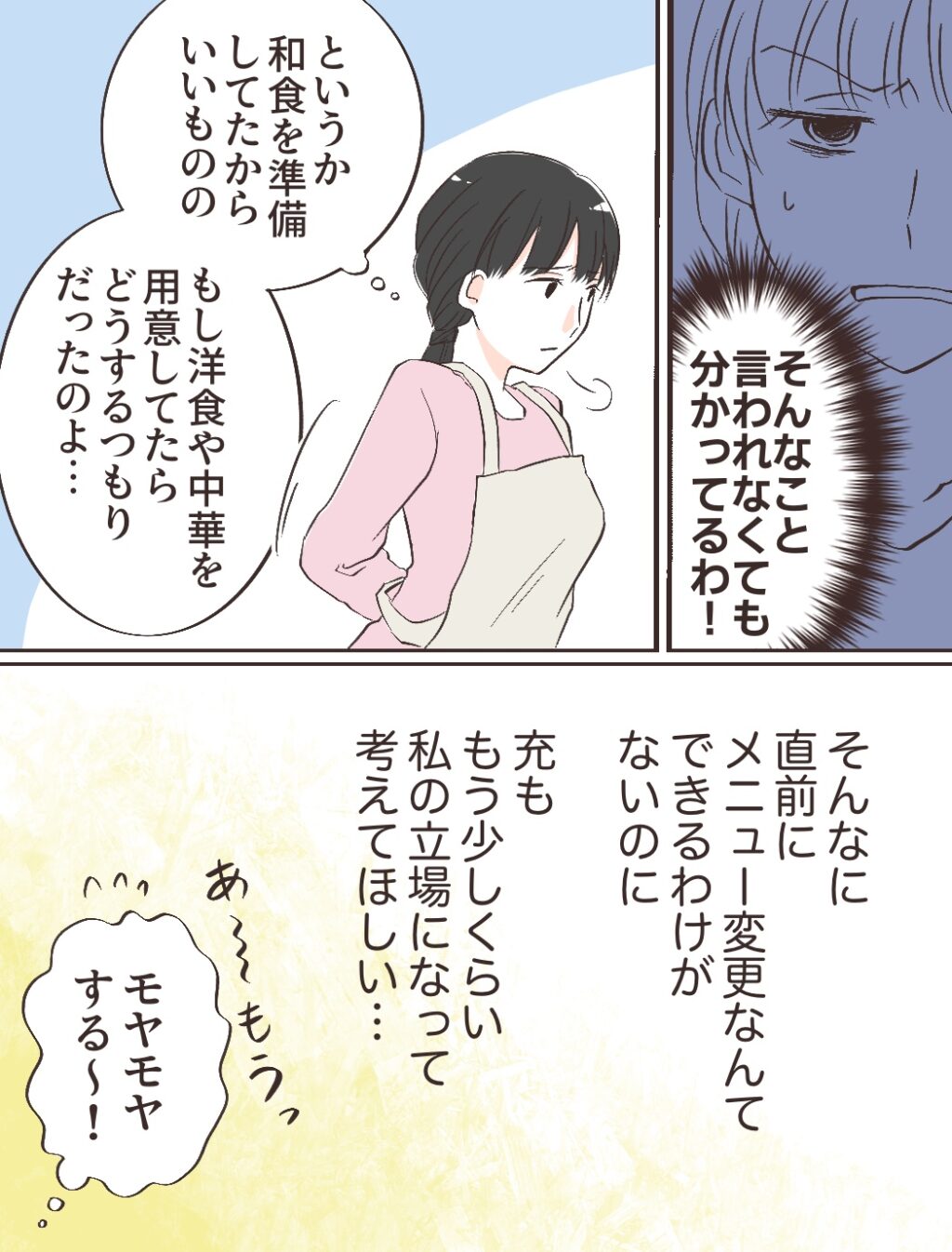 「そんなこと言われなくても分かってるわ!」と心の中で悪態をつきました。その後、気分を変えて料理をすることに。「というか、和食を準備してたからいいものの、もし洋食や中華を用意してたらどうするつもりだったのよ・・」そう呟きながら、そんなに直前にメニュー変更なんてできるわけがないのに、充ももう少しくらい私の立場になって考えてほしい・・「あーーーもうっ!モヤモヤする~!」と結局夫に対するモヤモヤばかりが募るのでした。