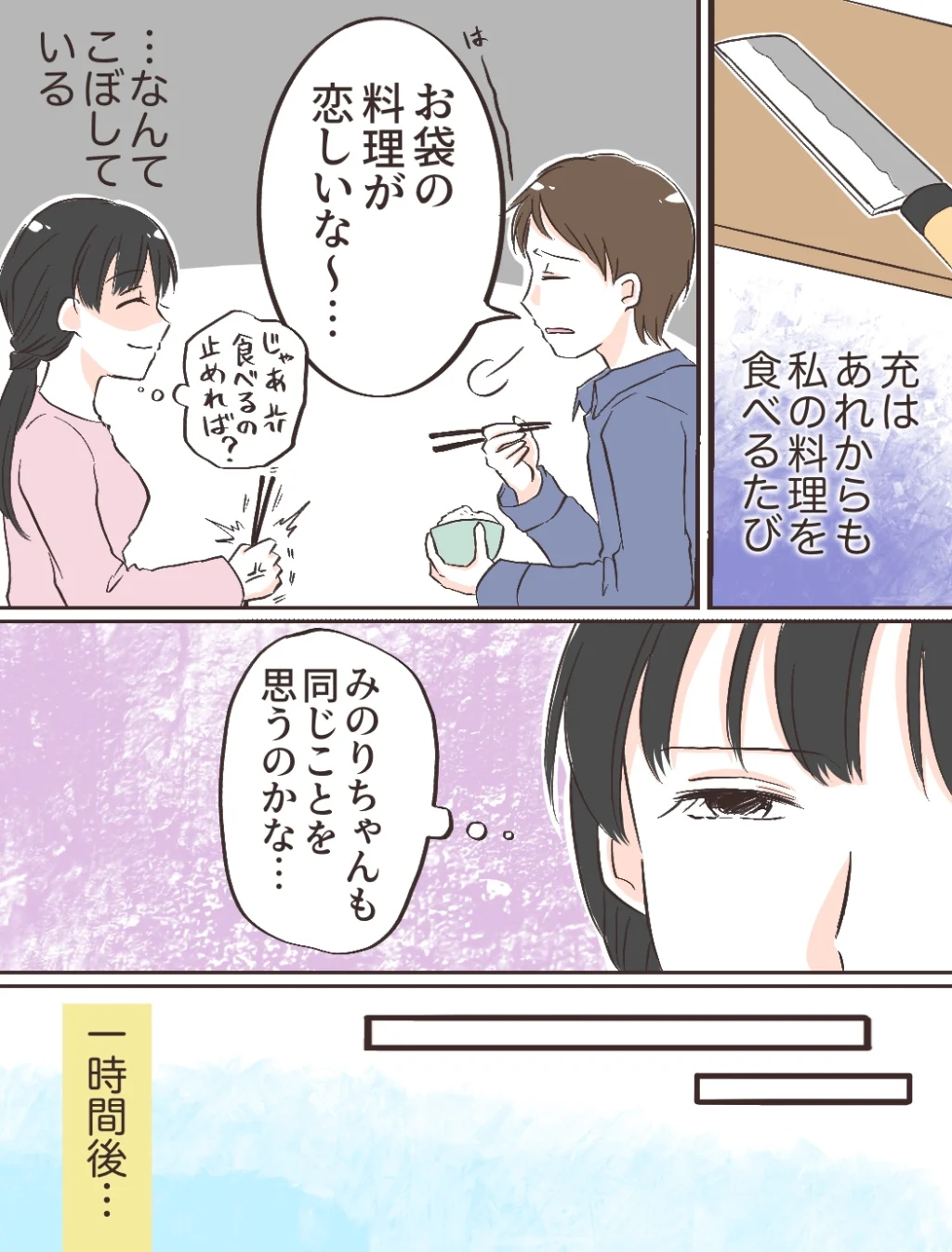 義両親がやって来た後も、夫は私の料理を食べるたびに「はーー、お袋の料理が恋しいな~・・」とこぼし、「じゃあ食べるのやめれば?」と私をイライラさせるのと同時に、「みのりちゃんも同じことを思うのかな・・」と不安な気持ちになりました。