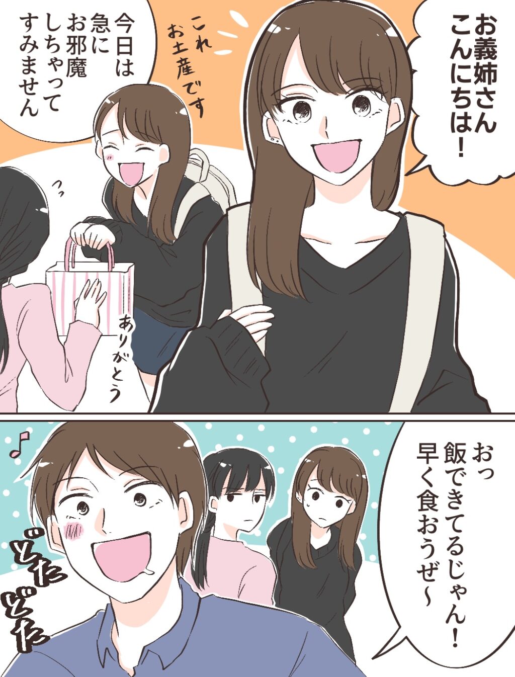 「お義姉さん、こんにちは!これお土産です。今日は急にお邪魔しちゃってすみません」みのりちゃんに挨拶していると、「おっ、飯できてるじゃん!早く食おうぜ~」と料理に向かって一直線の夫。