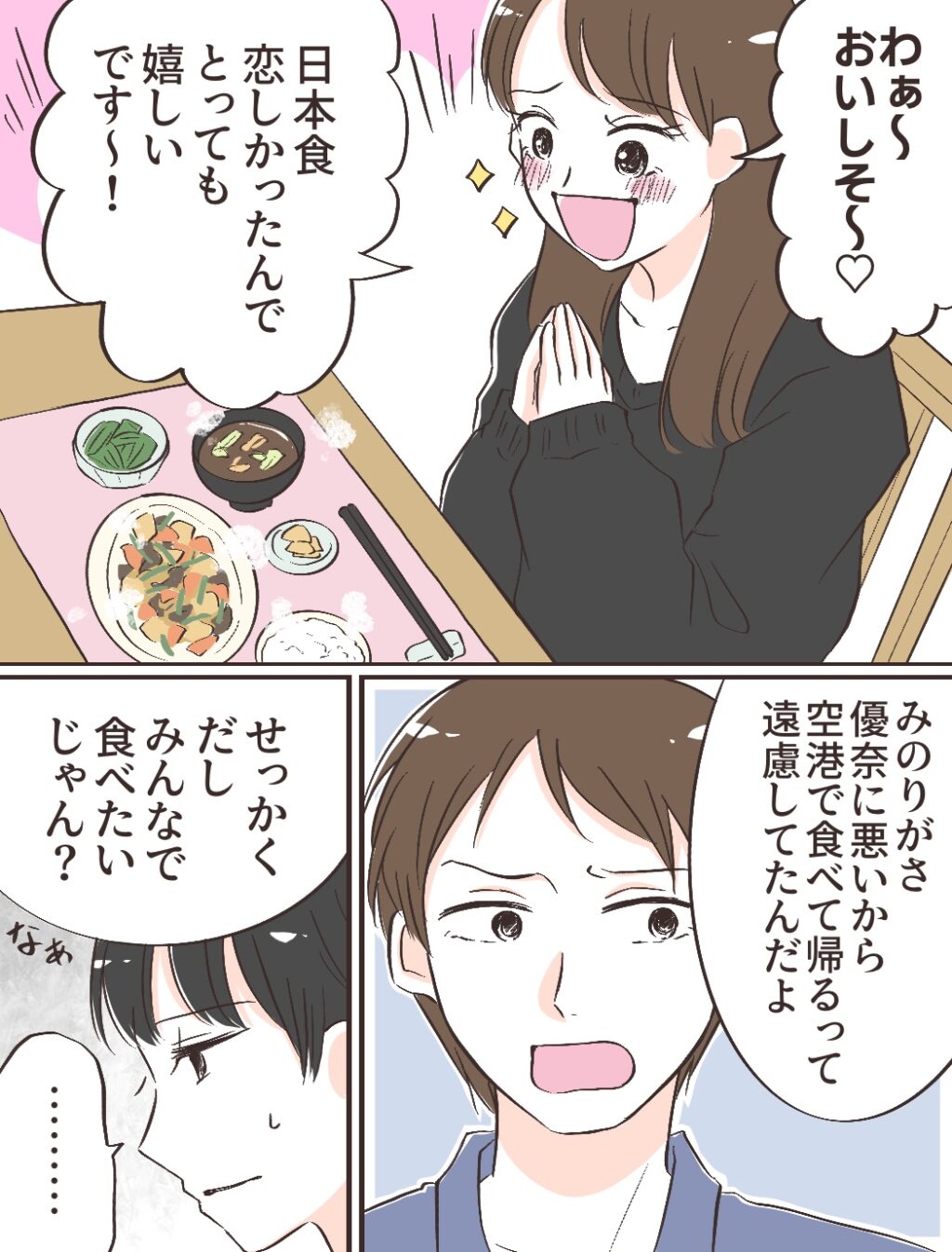 「わぁ~っおいしそ~!日本食恋しかったんでとっても嬉しいです~!」みのりちゃんがそう言うと、「みのりがさ、優菜に悪いから空港で食べて帰るって遠慮してたんだよ。せっかくだしみんなで食べたいじゃん?」夫にそう言われるも、「みのりちゃんが夫と同じように思ったら・・」そう思うと不安でたまりませんでした。