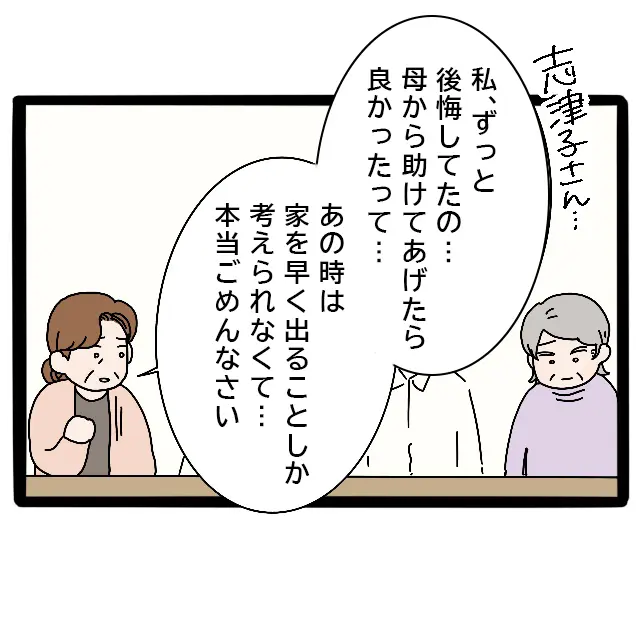 嫁いびりをする母に対し「自分がされてきたからといって嫁をいじめていい理由にはならない」と咎めた千恵おばちゃんですが、「志津子さん・・私、ずっと後悔してたの・・。母から助けてあげたら良かったって・・。あの時は家を早く出ることしか考えられなくて・・本当にごめんなさい」と後悔の言葉とともに母に謝罪しました。