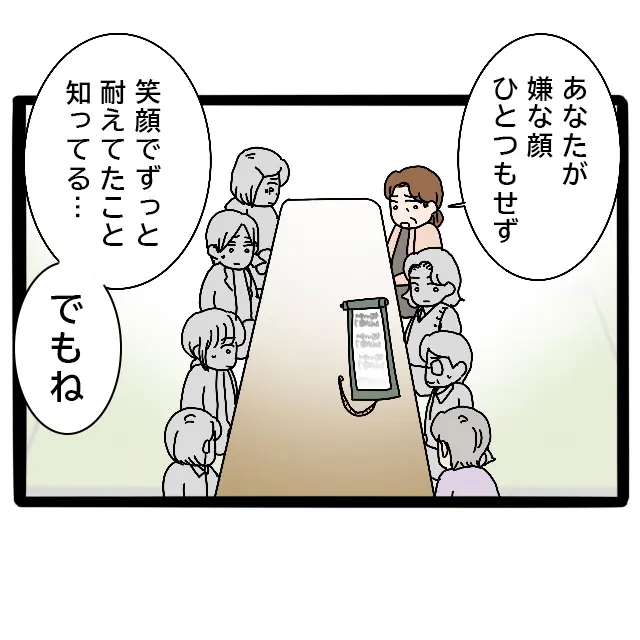 みずほ先輩は、私が自分と同じ辛い目に遭うことを心配し、私と隆明の結婚に反対しました。よっちゃんが「みずほは今幸せじゃないの?」と聞くと、触れてほしくない話題なのか兄が怒り出し、千恵おばちゃんが「吾郎は何か言うことないの?」と父に話しを振ると、父は気まずそうに視線を落とし言葉に詰まっていました。父も兄も自分の妻が嫁いびりをされていると知りながら見て見ぬふりをしてきたので何も言えないのでしょうね。