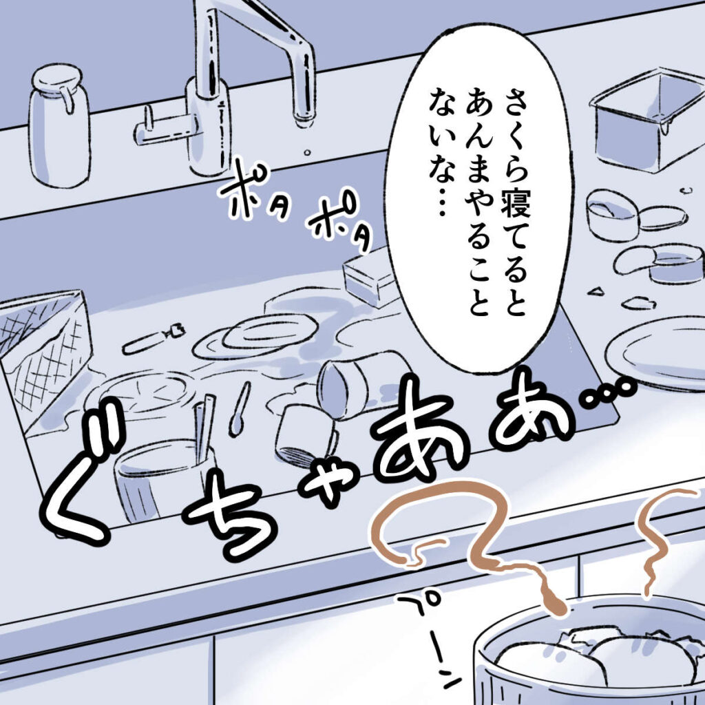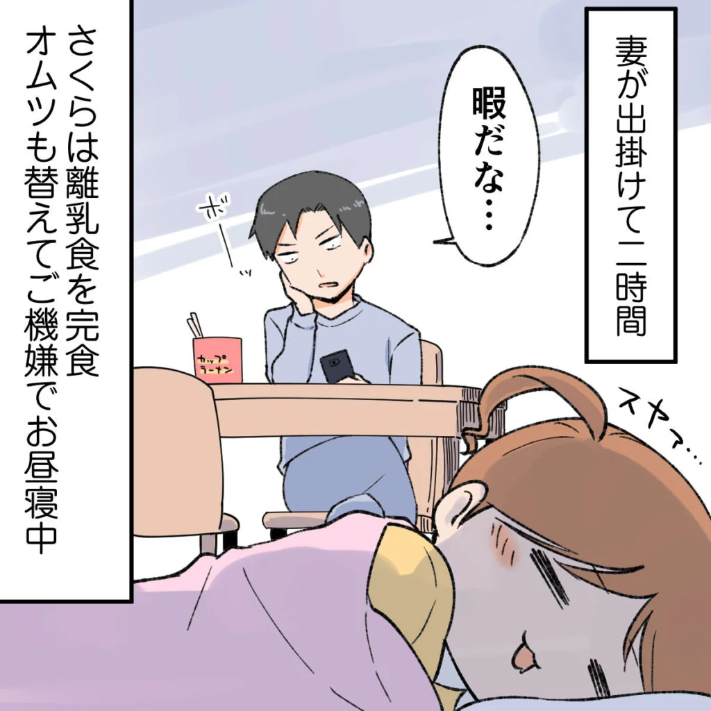 「さくらが寝てると、あんまやることないな・・・」キッチンが散らかっていることも、オムツがゴミ箱に直捨てされていることも気に留めず、ただスマホをいじって時間をつぶします。しかし、次第にそれさえ飽きてきました。