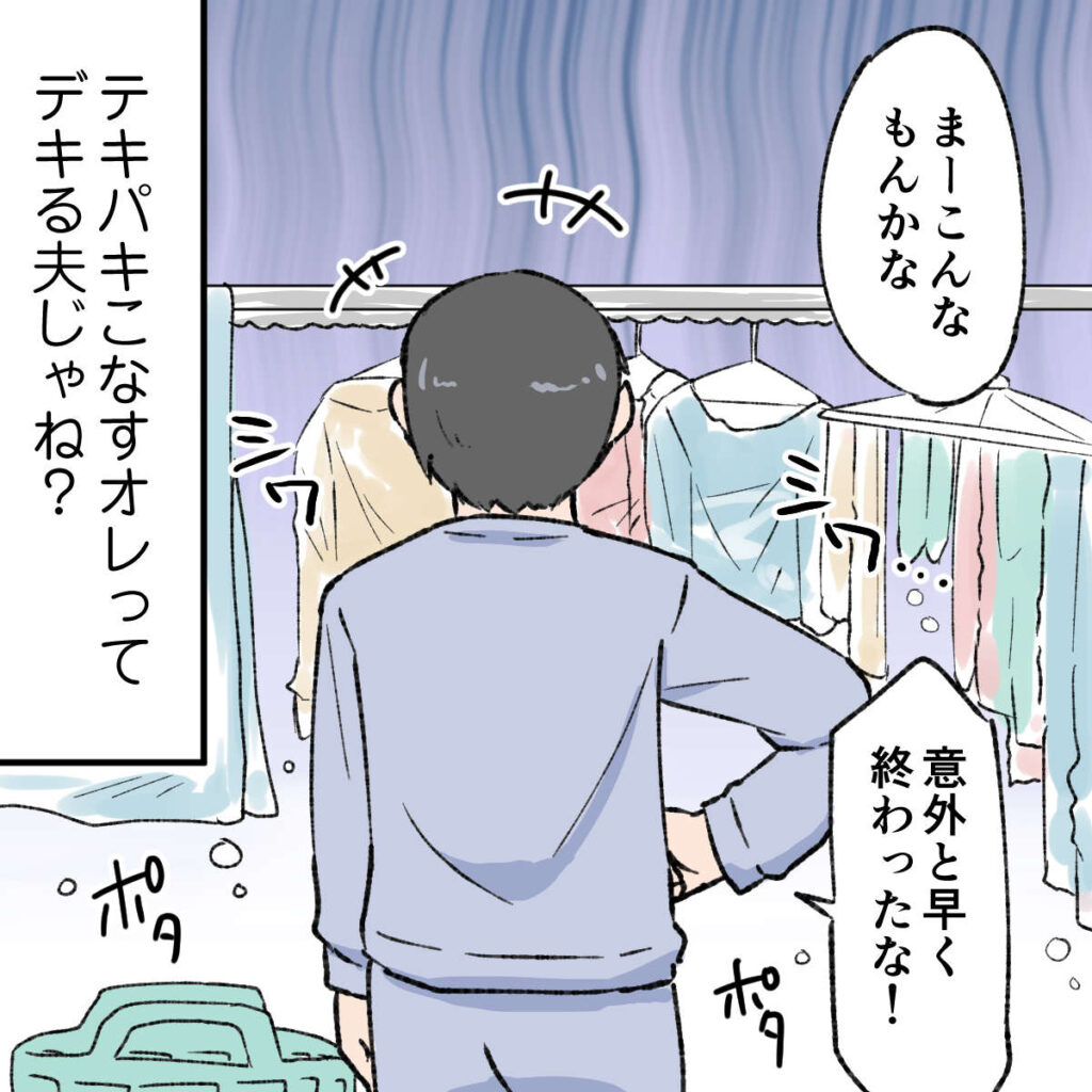 「まーこんなもんかな・・・意外と早く終わったな!」洗濯物の干し方とかよく分からないけど、とりあえずハンガーにかけておけば、天気も良いし乾くでしょ。妻が出かけてる間にテキパキ家事をこなす俺って、なかなかにできる夫。