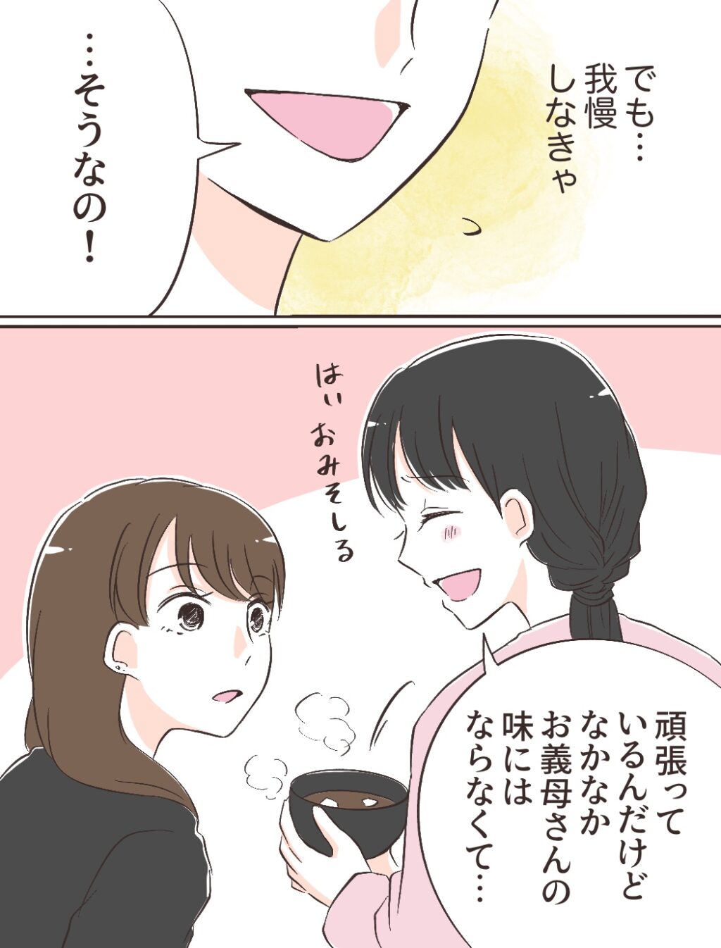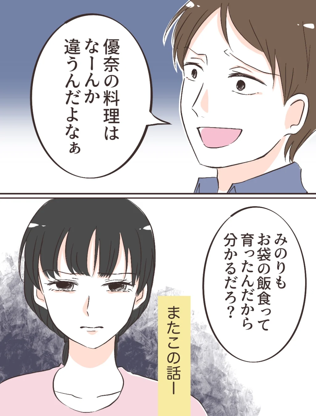料理上手な義母にはまだまだ及ばないかもしれません。それでもみのりちゃんは、私が一生懸命作った料理を「美味しい!」と目を輝かせながら食べてくれました。こだわったお出汁にも気づいてくれて、作った甲斐があったと涙ぐんでいたその時、充の「美味いっちゃ美味いけど、やっぱりお袋の味とは違う」という余計な一言で、場の空気が一瞬にして凍りついたのでした。