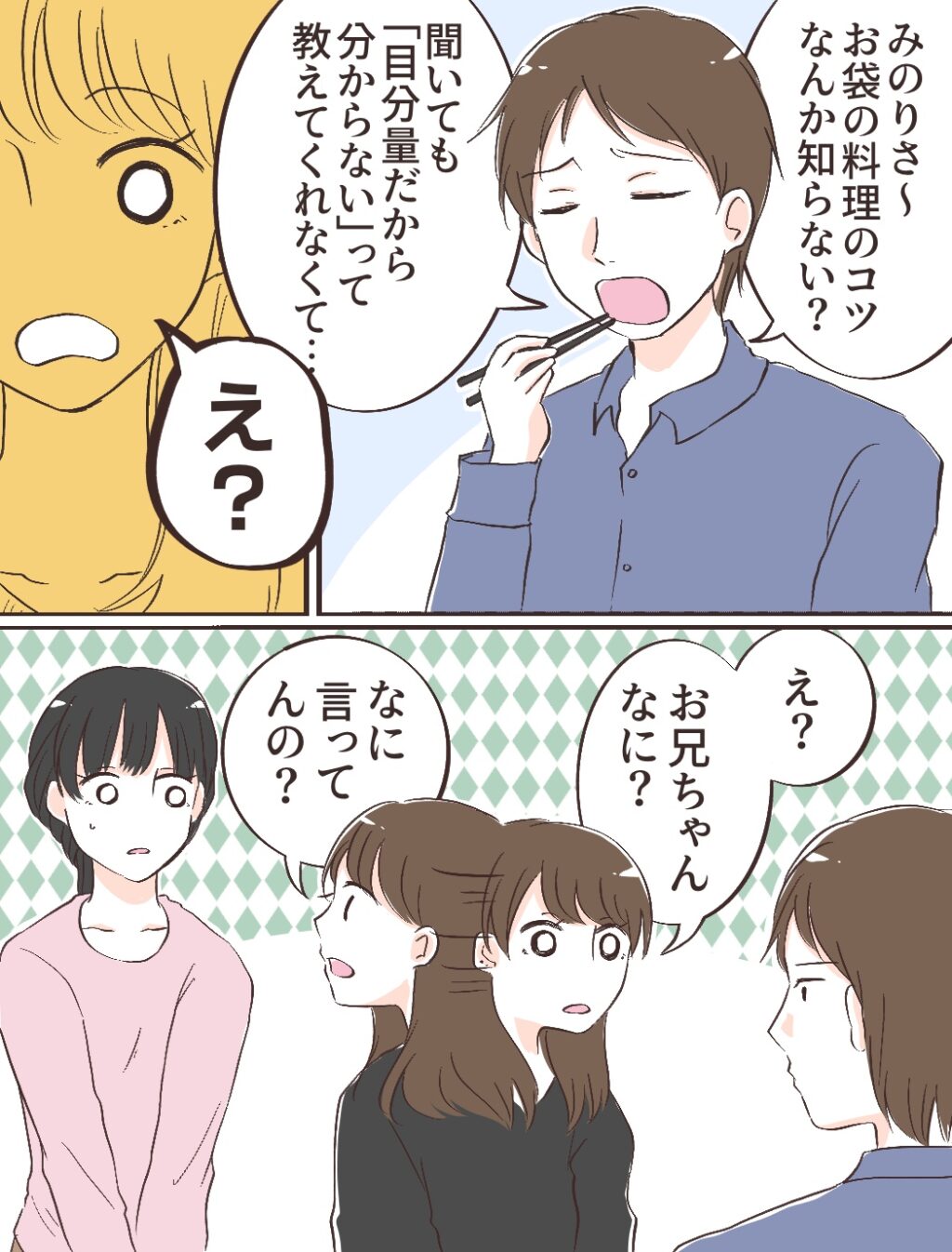 しかし、それをいいことに充の小言はますますエスカレート。「みのりさ~お袋の料理のコツなんか知らない?聞いても『目分量だから分からない』って教えてくれなくて」と、みのりちゃんにまで話を振り始めました。するとみのりちゃんは「え?お兄ちゃんなに?なに言ってんの?」と、ぽかんとした表情を浮かべます。