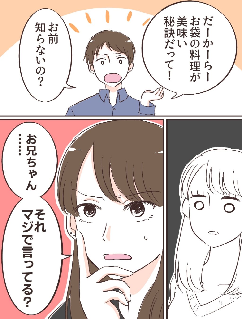 何を言われているのか分からず、口をぽかんと開けたままのみのりちゃん。それでも充は、「だーかーらーお袋の料理が美味い秘訣だって!お前知らないの?」と、なんとか答えを引き出そうとします。するとみのりちゃんは一瞬言葉を失い、「お兄ちゃん・・・それマジで言ってる?」と怪訝そうな表情をしました。