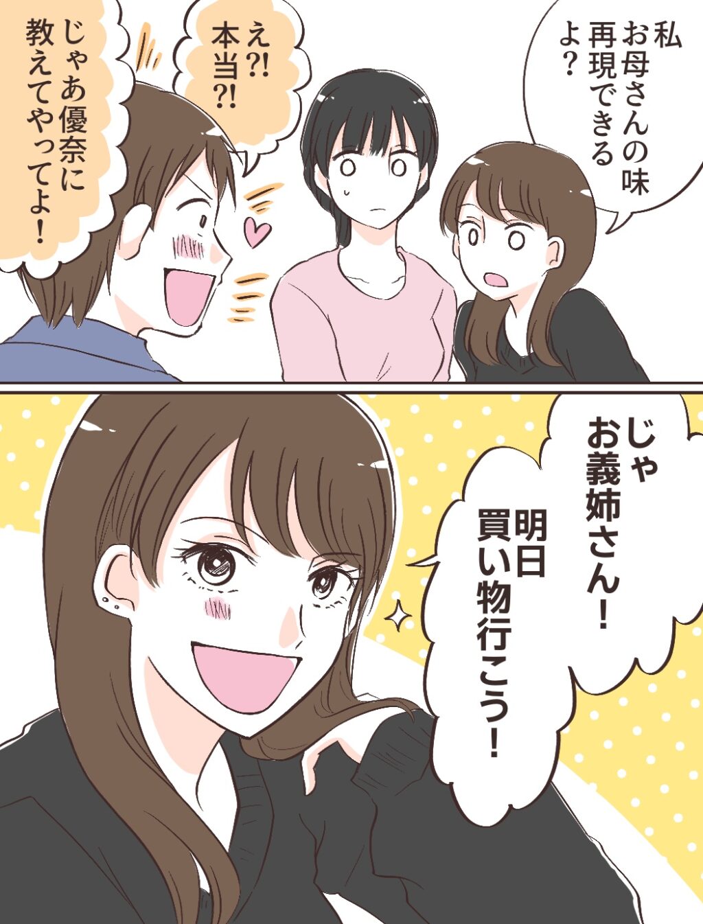 「私、お母さんの味再現できるよ?」当然のようにそう話すみのりちゃんに、充はパッと目を輝かせ「本当!?じゃあ優奈に教えてやってよ」と嬉しそうに言いました。するとみのりちゃんは、「じゃ、お義姉さん!明日買い物行こう!」と得意げに私を誘ったのでした。
