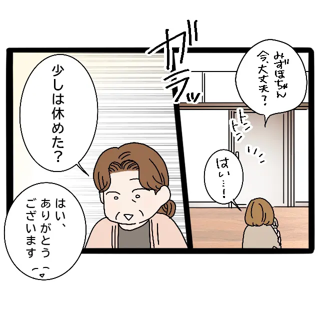 一方、千恵おばさんは部屋で休むみずほ先輩のところへ訪れていました。「少しは休めた?」と問いかけるおばさんへ「はい、ありがとうございます」と笑顔で答えます。