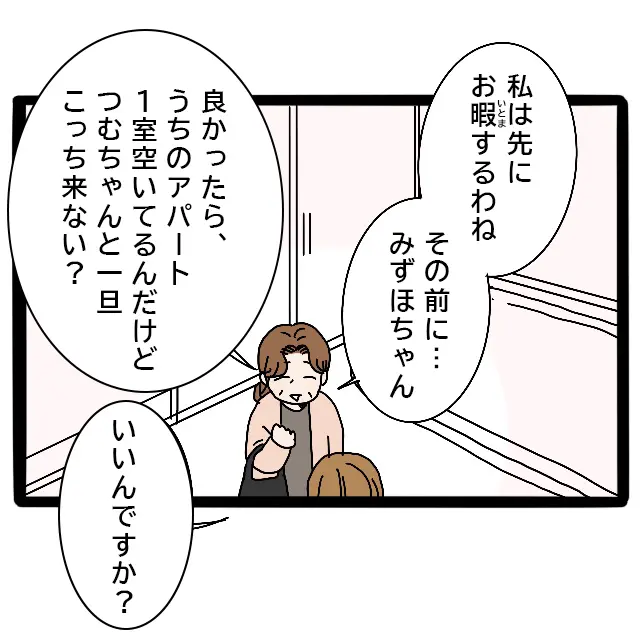 穏やかそうなみずほ先輩に安心したおばさんは「私は先にお暇するわね。その前に・・・みずほちゃん」と、ある提案をします。「良かったら、うちのアパート1室空いているんだけど、つむちゃんと一旦こっち来ない?」「いいんですか?」