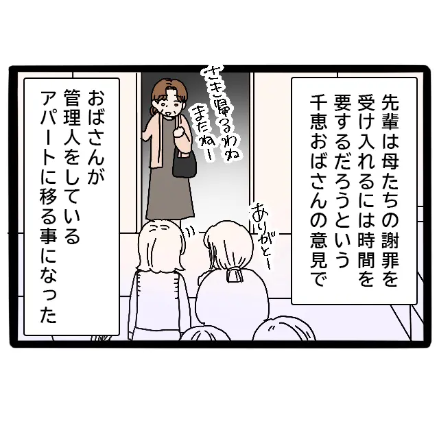 みずほ先輩が母たちの謝罪を受け入れるには時間を要するだろう、という千恵おばさんの意見で、先輩はおばさんが管理しているアパートに移る事になりました。またね、と先に帰るおばさんを、みんなで見送ります。