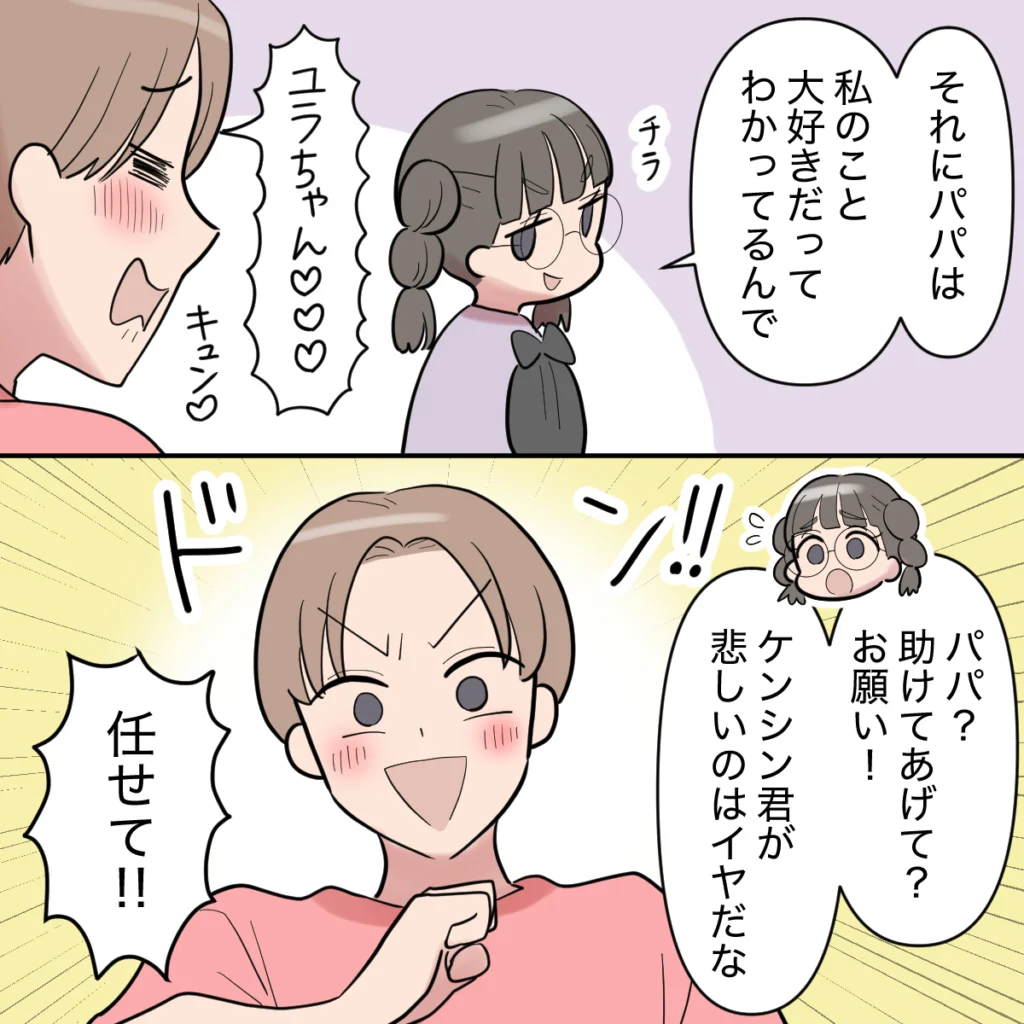 すると、「それにパパは私のこと大好きだってわかってるんで」そう言いながら弟の方をチラリとみるユラちゃんの言葉にキュンキュンする弟は、「ユラちゃん!!」とメロメロ。「パパ?助けてあげて?お願い!ケンシン君が悲しいのはイヤだな」そう言われて「任せて!!」と自信満々に胸をドーンと叩きました。