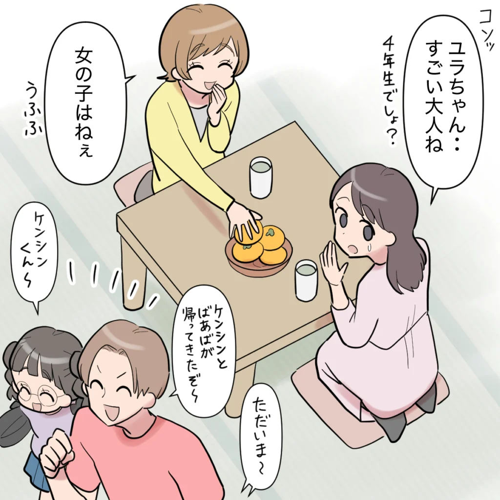 その後、「ユラちゃん・・すごい大人ね。4年生でしょ?」リンさんにそう言うと、「女の子はねぇ・・うふふ」と微笑み、その傍らでは「ケンシンとばあばあが帰ってきたぞ~」「ケンシン君~」と盛り上がるユラちゃんと弟の姿が。