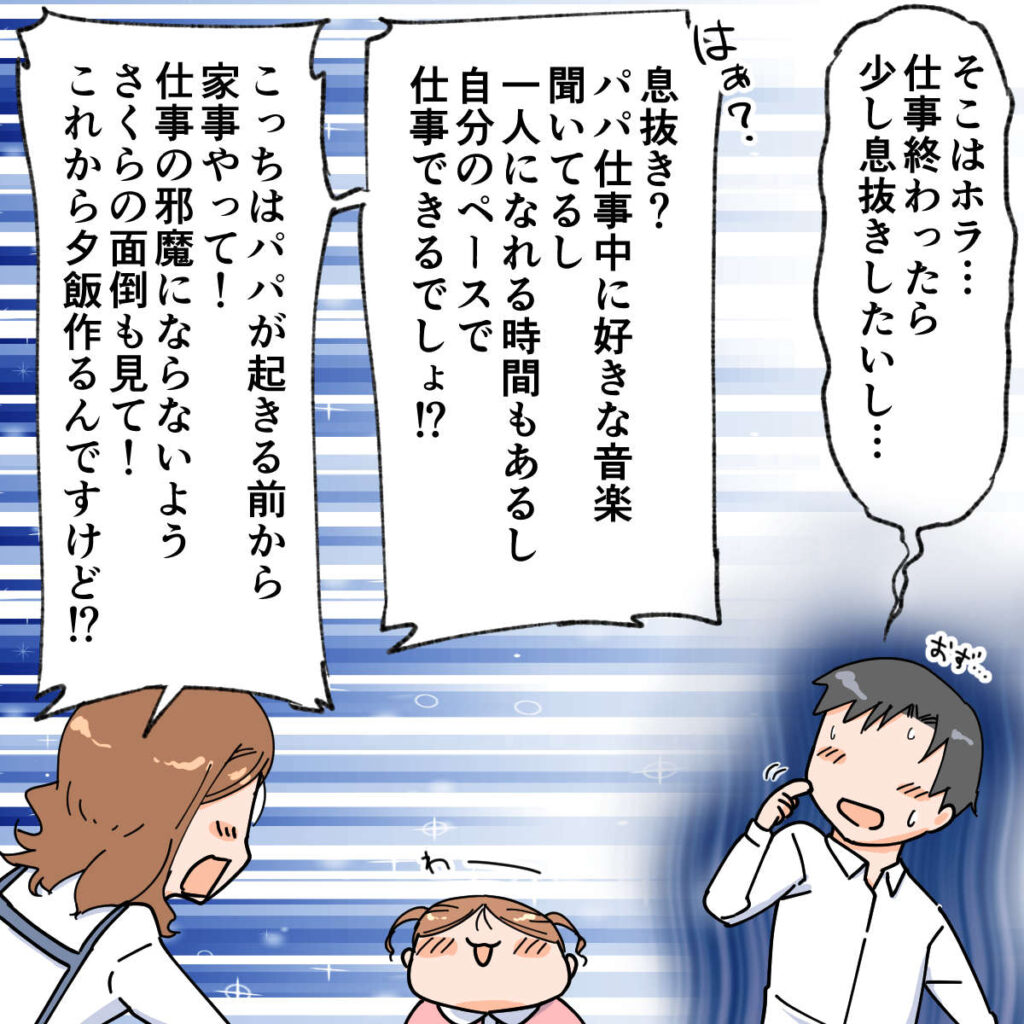 勢いに押されながら「そこはホラ・・・仕事終わったら少し息抜きしたいし・・・」としどろもどろに言えば、「息抜き?パパ仕事中に好きな音楽聞いてるし、一人になれる時間もあるし自分のペースで仕事できるでしょ!?こっちはパパが起きる前から家事やって!仕事の邪魔にもならないようさくらの面倒も見て!これから夕飯作るんですけど!?」と痛烈なカウンターが。