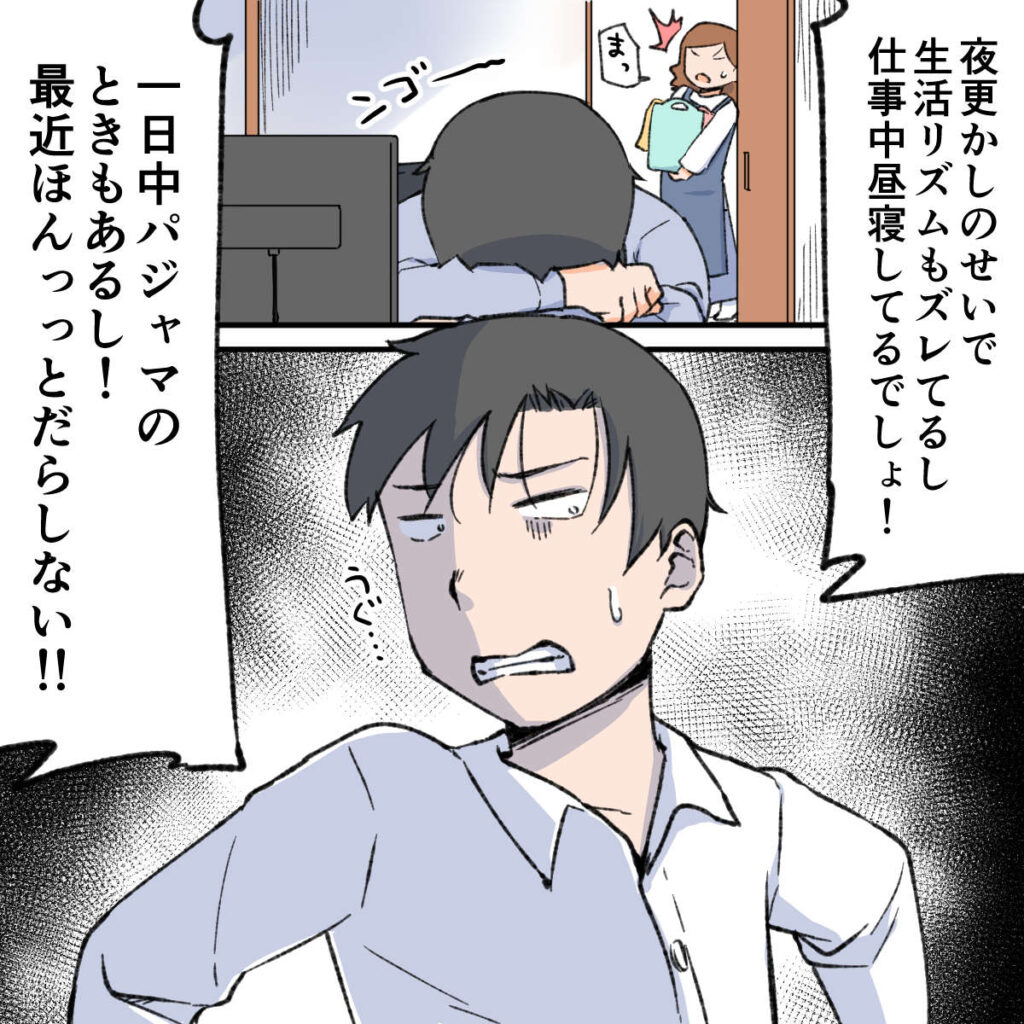 さらにゆきのは「夜更かしのせいで生活リズムもズレてるし仕事中昼寝してるでしょ!一日中パジャマのときもあるし!最近ほんっとだらしない!!」ときっぱり。