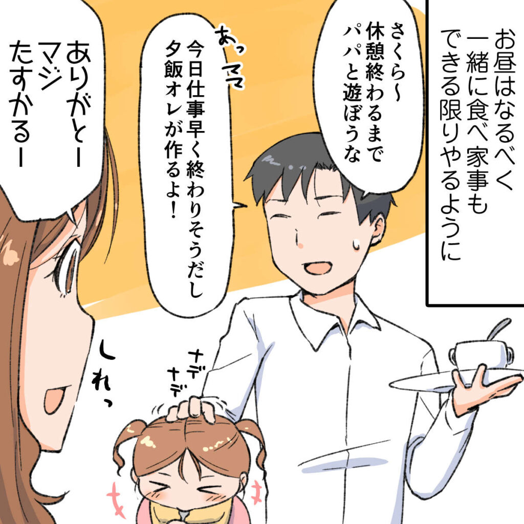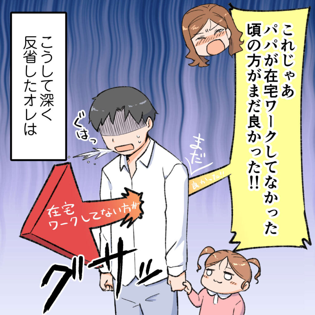 極めつけに「これじゃあパパが在宅ワークしてなかった頃の方がまだ良かった!!」と言い切られます。こうして深く反省したオレは、お昼はなるべく一緒に食べ家事もできる限りやるように。