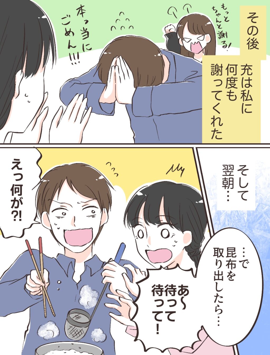 その後、充は何度も私に謝ってくれました。そして翌朝。「・・で、昆布を取り出したら・・あ~待って待って!」「えっ何が?!」私と充はキッチンでてんやわんや。いつも出汁からとって作っていた私の料理に文句を言っていたことを反省した充は、自分でも料理をしてみようと思ってくれたようです。