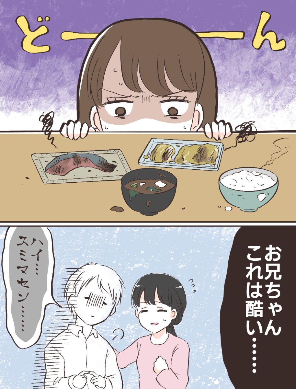 悪戦苦闘しながらなんとか朝ご飯を完成させた充。テーブルに並んだお世辞にも美味しそうとは言えない味噌汁、卵焼き、焼き鮭を見たみのりちゃんは言葉を失っていました。「お兄ちゃん、これは酷い・・」と呟くみのりちゃんの言葉に「ハイ・・スミマセン・・」と落ち込む充。充のあまりの落胆ぶりに、私は必死にフォローの言葉をかけました。