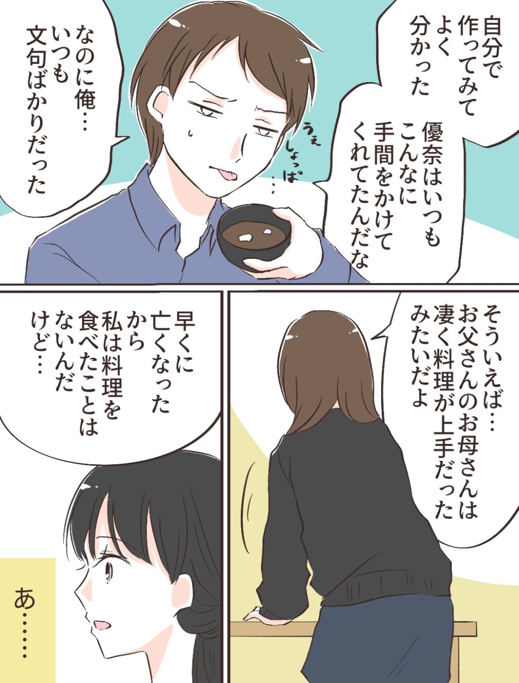 充は、自分の作った味噌汁を一口食べると「うぇ、しょっぱ・・」と顔をしかめ、「自分で作ってみてよく分かった。優奈はいつもこんなに手間をかけてくれたんだな。なのに俺・・いつも文句ばかりだった」と申し訳なさそうに言いました。すると、みのりちゃんが「そういえば・・お父さんのお母さんはすごく料理が上手だったみたいだよ。早くに亡くなったから私は料理を食べたことはないんだけど・・」と思い出したように言いました。それを聞いた私は「あ・・」と以前のお義父さんの言葉を思い出しました。
