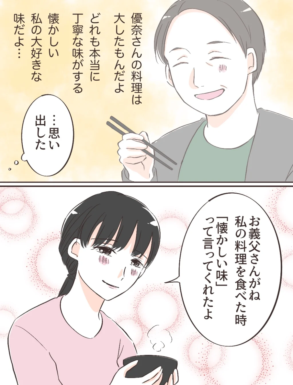 お義父さんが私の料理を食べたときに「優奈さんの料理は大したもんだよ。どれも本当に丁寧な味がする。懐かしい私の大好きな味だよ・・」と言ってくれて嬉しかったことを思い出した私は、「お義父さんがね、私の料理を食べた時『懐かしい味』って言ってくれたよ」とみのりちゃんと充に伝えました。