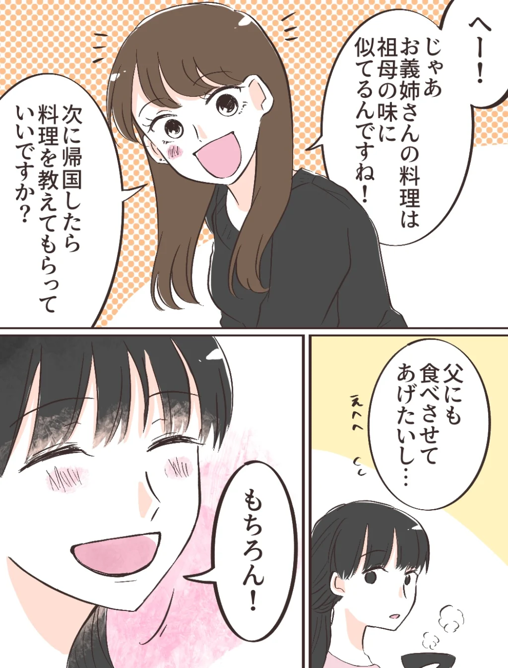 すると「へー!じゃあお義姉さんの料理は祖母の味に似てるんですね!次に帰国したら料理を教えてもらっていいですか?」とパッと目を輝かせたみのりちゃんは、そのあと「父にも食べさせてあげたいし・・」とちょっと照れたように言いました。私は「もちろん!」と満面の笑みで答えました。