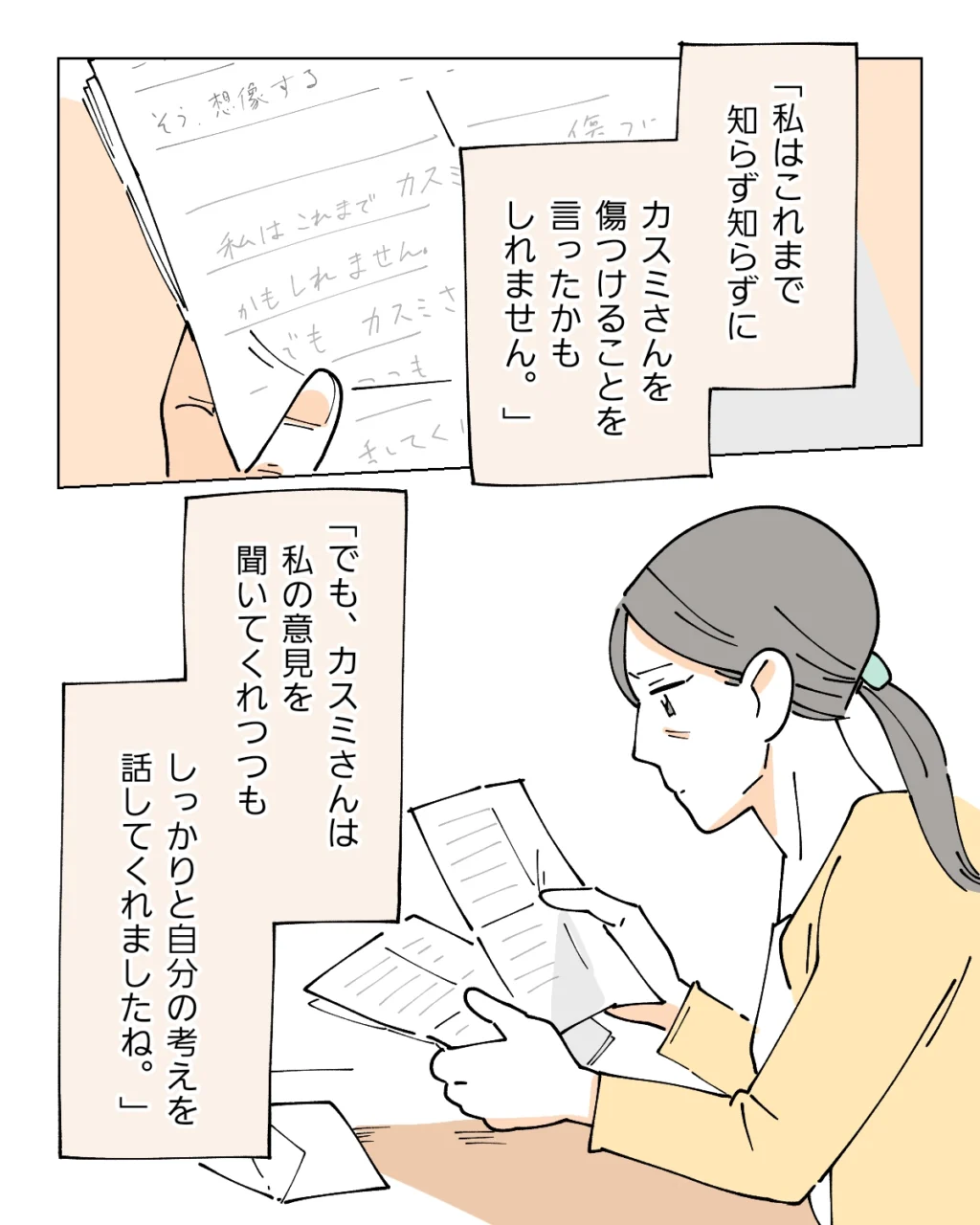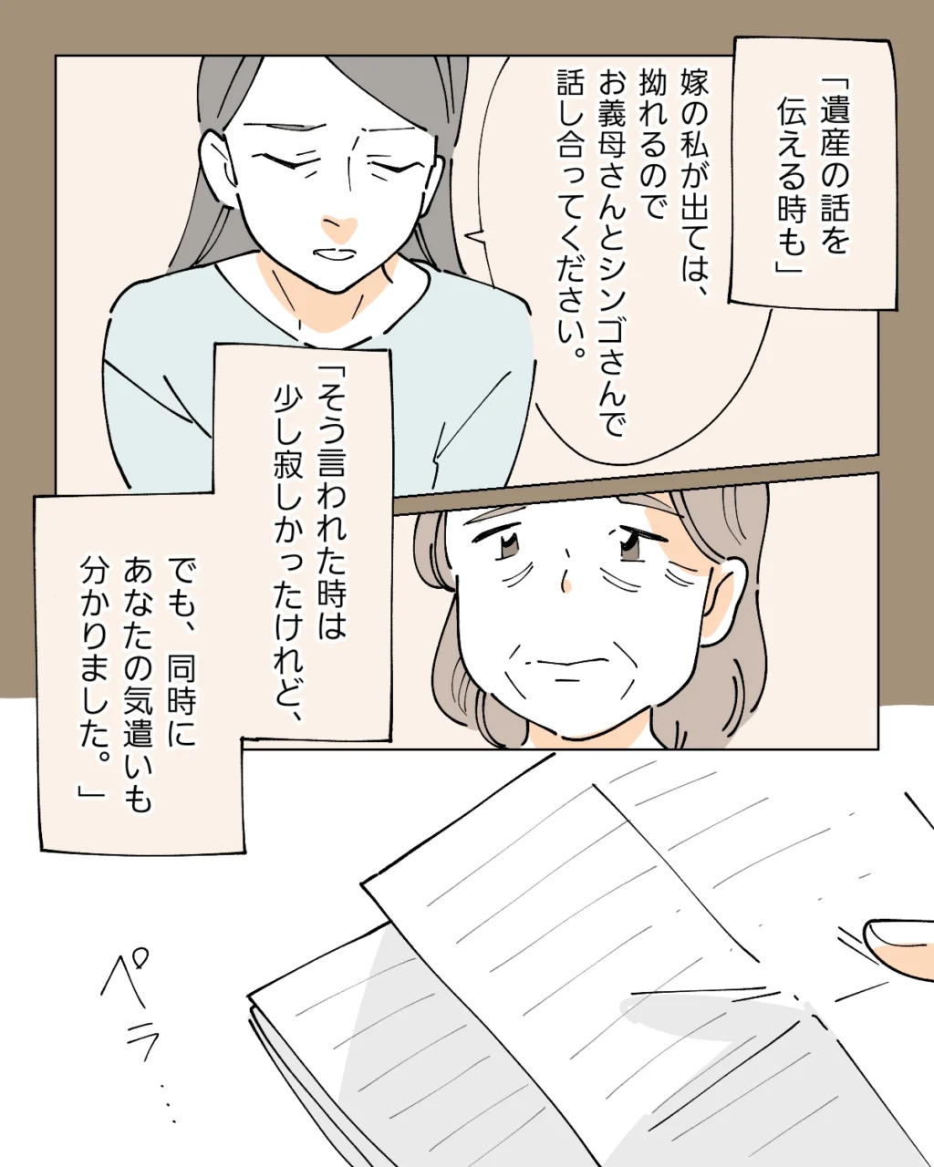 私は夢中になって、何枚にもわたる義母の手紙を読み進めました。[私はこれまで、知らず知らずにカスミさんを傷つけることを言ったかもしれません。でも、カスミさんは私の意見を聞いてくれつつも、しっかりと自分の考えを話してくれましたね。]その一文を読んだ時、かつて義母とシンゴと遺産の話をした時のことを思い出しました。
