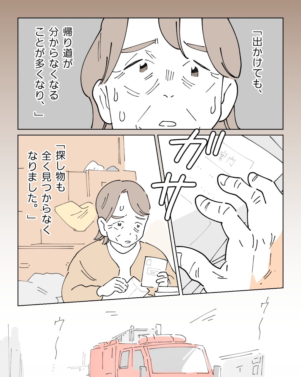 出かけたはずなのに、何をしに出たのか分からない。自分の家への帰り道が思い出せない。探し物をしても、結局どこにあるのか分からないまま・・・。そんなことが少しずつ増えていきました。