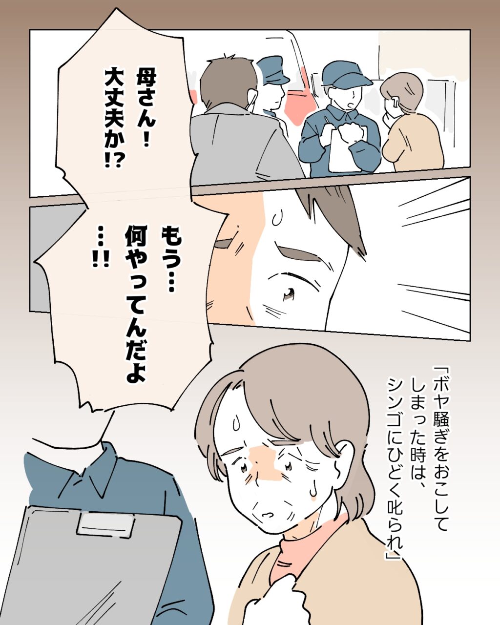 義母の物忘れは、日に日に深刻さを増していきました。そしてついに、キッチンの火を消し忘れてボヤ騒ぎを起こすまでになってしまったのです。警察から連絡を受けて駆けつけたシンゴは、「母さん大丈夫か!?もう何やってんだよ!」と、心配と怒りが入り混じった声を義母にぶつけていました。