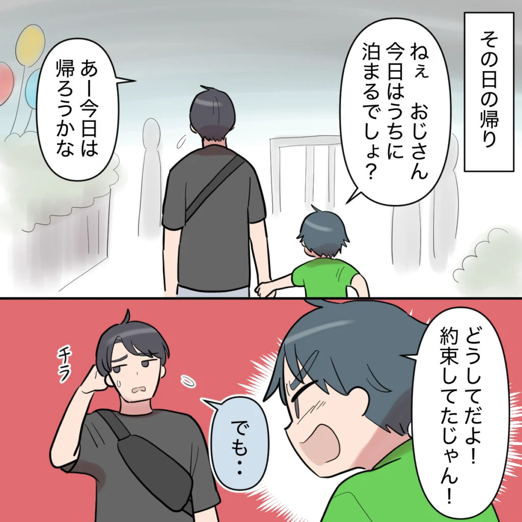 その日の帰り。「ねぇおじさん、今日はうちに泊まるでしょ?」というタイガ君の問いかけに、シンジは珍しく「あー今日は帰ろうかな」と答えます。もちろんタイガ君は「どうしてだよ!約束してたじゃん!」と猛反発。するとシンジは、困ったように「でも・・・」とつぶやき、私たちの方へ視線を向けました。