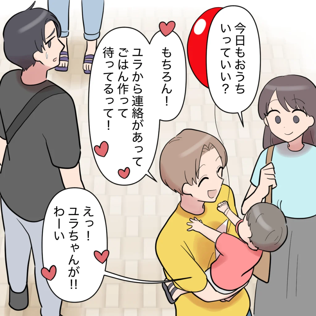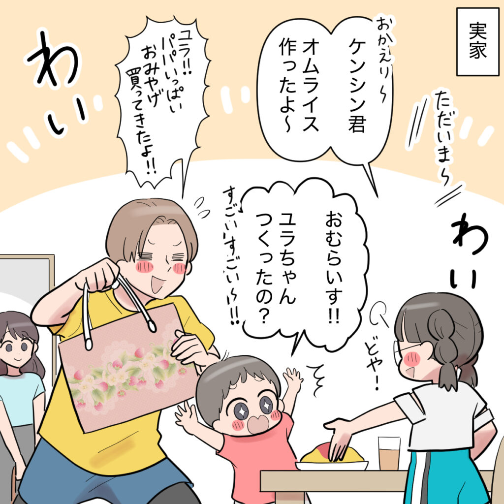 実家に帰ると、ユラちゃんが「ケンシン君、オムライス作ったよ~」と笑顔で出迎えてくれました。ケンシンは「おむらいす!ユラちゃんつくったの?すごいすごい」と大はしゃぎ。この頃にはもう、ケンシンはシンジがいなくても平気でいられるようになっていました。