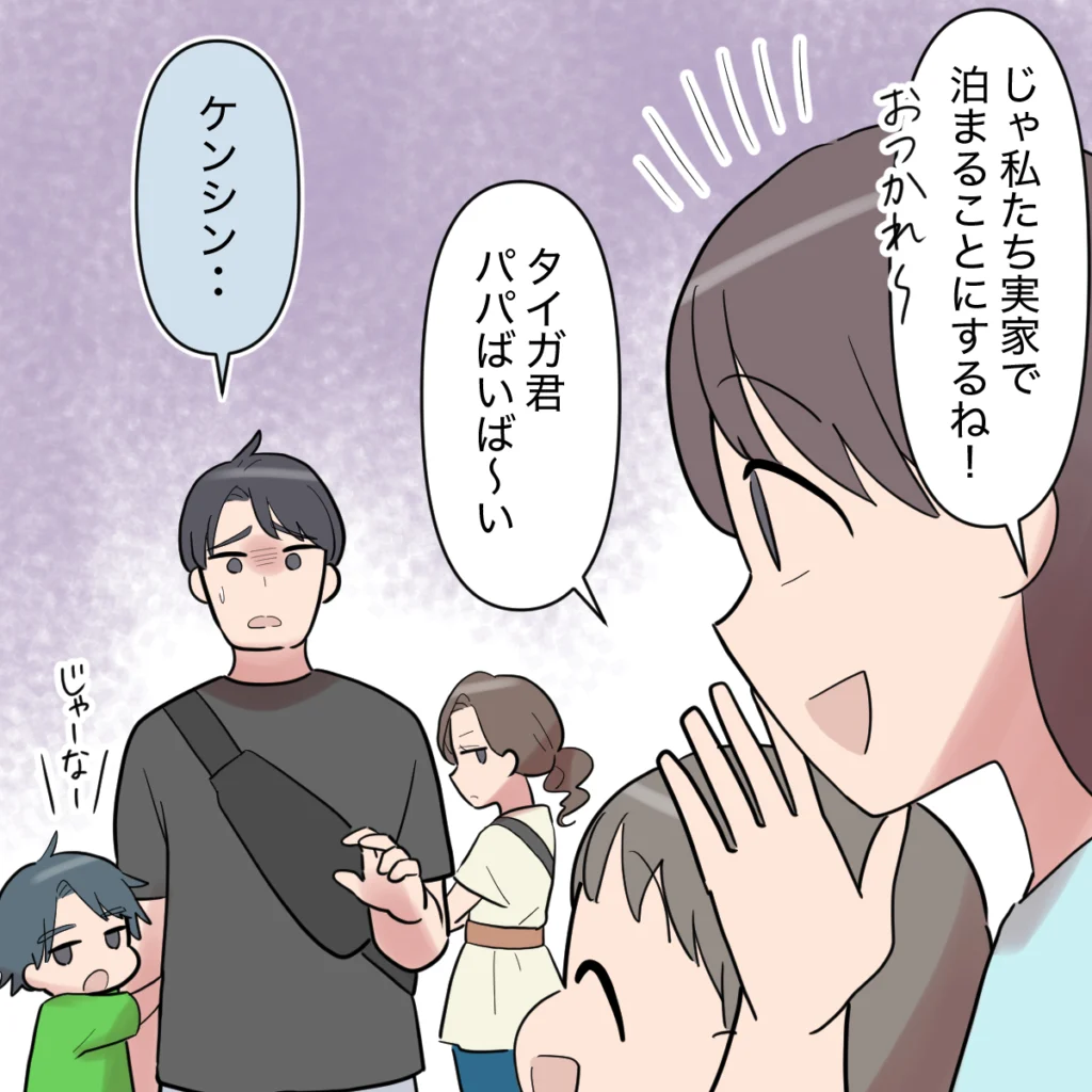 けれど、この状況を選んだのは他でもないシンジ自身です。「じゃ、私たち実家で泊まることにするね!」そう声をかけると、シンジは「ケンシン・・・」とつぶやき、寂しそうな表情を浮かべました。