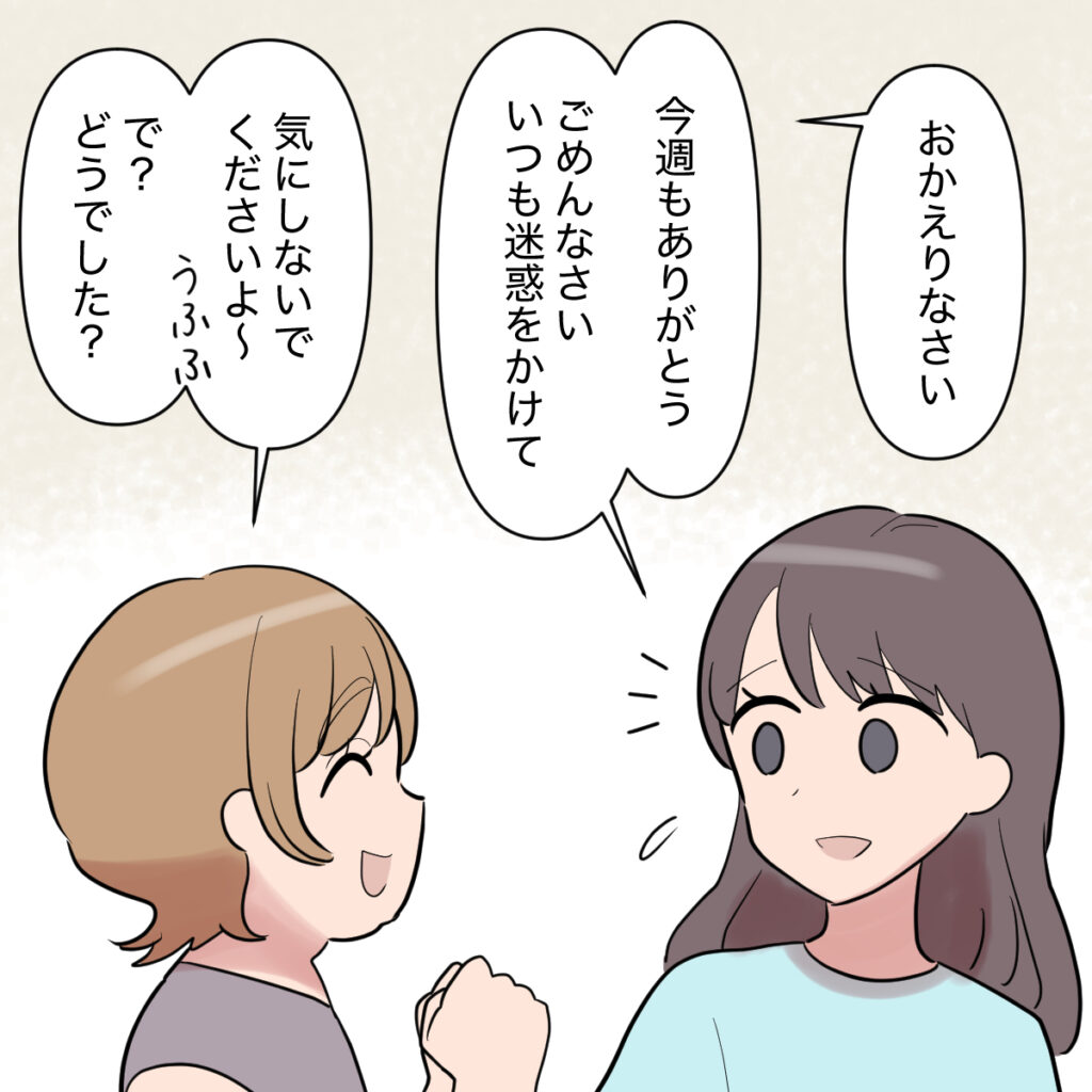 わいわいと賑やかに笑い合う3人の姿を微笑ましく眺めていると、リンさんが「おかえりなさい」と優しく声をかけてくれました。「今週もありがとう。ごめんなさい、いつも迷惑をかけて」そう謝ると、リンさんは「気にしないでくださいよ~・・・で、どうでした?」と、どこか楽しそうな表情を浮かべたのでした。